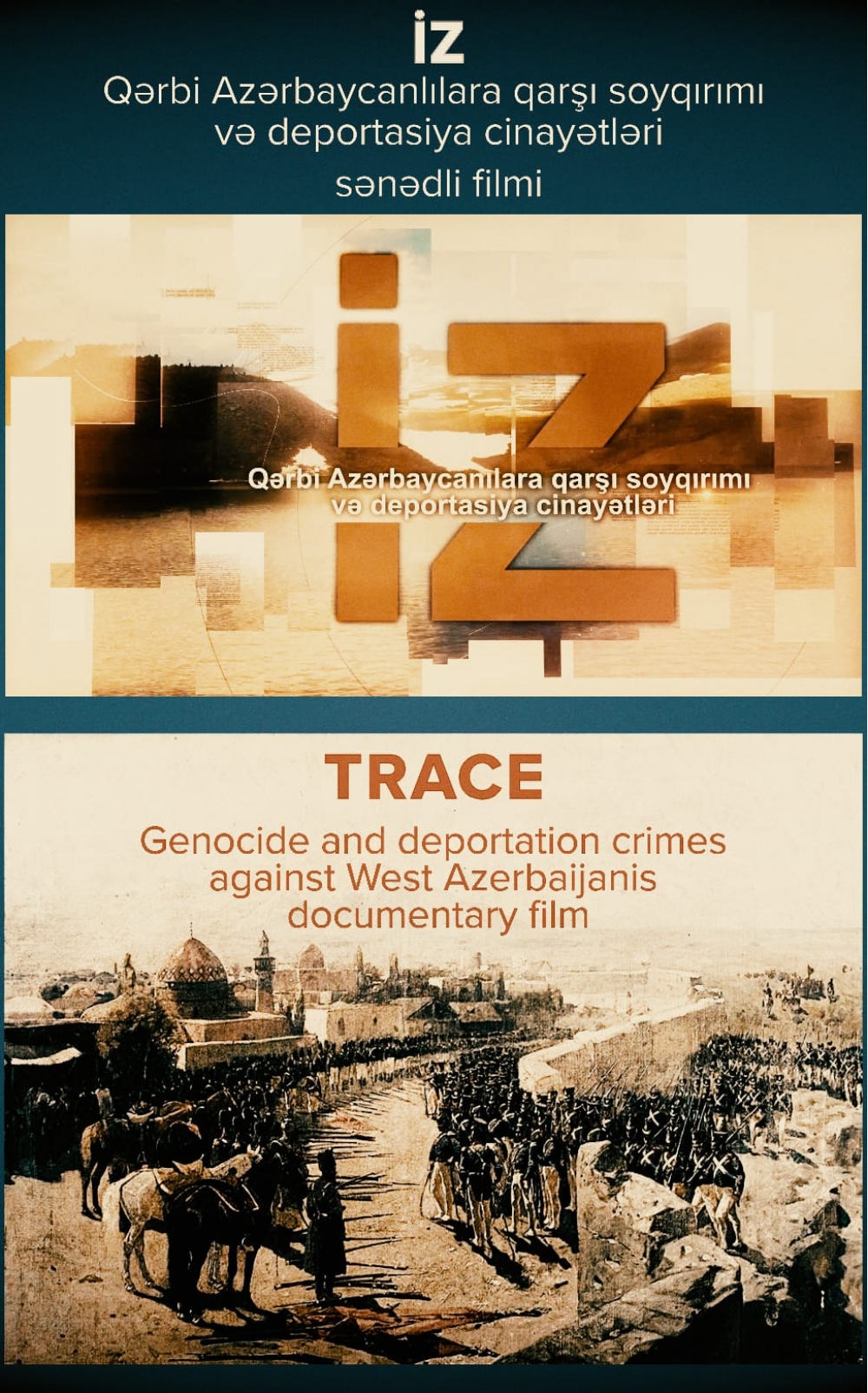 "İZ- Qərbi azərbaycanlılara qarşı soyqırımı və deportasiya cinayətləri" sənədli filmində əsasən Qərbi Azərbaycandan olan elm adamlarının, şair və yazıçıların, ziyalıların fikirləri yer alıb. Filmin əsas məqsədi, Qərbi Azərbaycanla bağlı beynləlxalq ictimaiyyətdə obyektiv təsəvvür formalaşdırmaq, əslən Qərbi Azərbaycandan olan azərbaycanlıarı böyük qayıdışa hazırlamaqdan ibarətdir.
