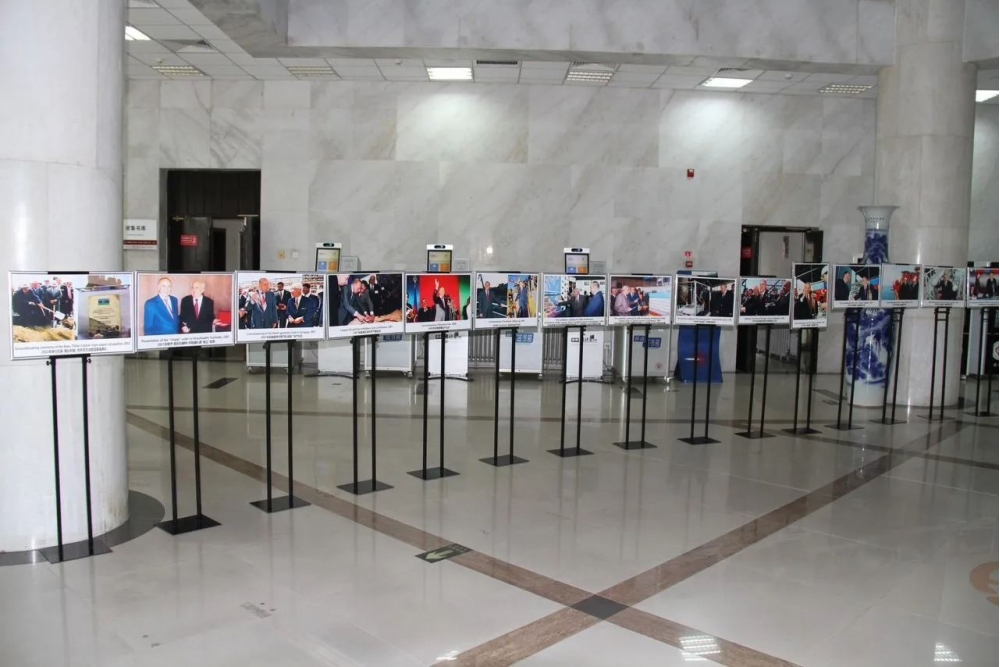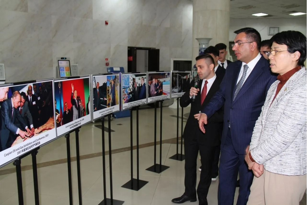 Daha sonra, Ümummilli Lider Heydər Əliyevin 100 illik yubileyi münasibətilə Çin Neft Universitetində təşkil olunan, Ulu Öndərin ölkəmizin neft-qaz sənayesinin inkişafına göstərdiyi yüksək diqqəti əks etdirən nadir fotoların da yer aldığı sərginin açılış mərasimi keçirilib. Sərginin açılışında Ulu Öndər Heydər Əliyevin uzaqgörən və müdrik siyasəti nəticəsində ölkəmizin bütün sahələrdə davamlı inkişafı üçün sağlam təməllərin qoyulduğu qeyd edilib. Ümummilli Lider Heydər Əliyevin müəyyənləşdirdiyi enerji strategiyasının ölkəmizin hərtərəfli inkişafında mühüm rolundan, Ulu Öndərin Azərbaycan neftçilərinə göstərdiyi qayğıdan bəhs olunub. Açılışda Çin Xalq Respublikasında təşkil olunan sərginin dost Çin xalqının Azərbaycanın Ümummilli Liderinə olan sonsuz hörmətinin bariz nümunəsi olduğu diqqətə çatdırılıb. Ulu Öndər kimi dahi şəxsiyyətə həsr olunan sərginin universitətdə təşkilinin təhsil ocağı üçün vacibliyi vurğulanıb.