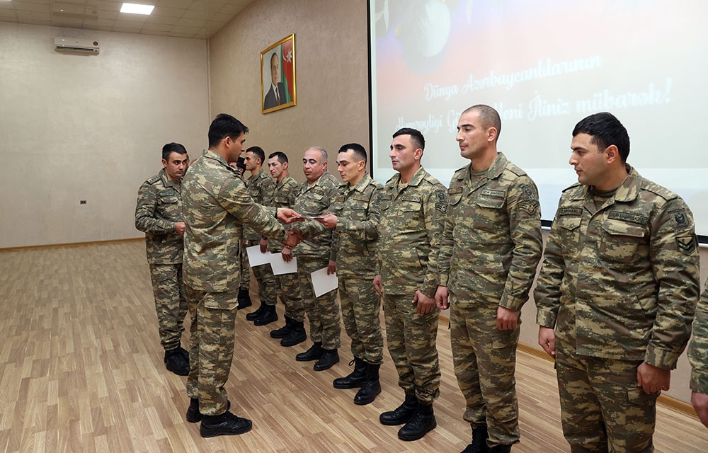 Müdafiə naziri general-polkovnik Zakir Həsənovun təsdiq etdiyi plana əsasən, 31 Dekabr - Dünya Azərbaycanlılarının Həmrəyliyi Günü və Yeni il bayramı münasibəti ilə Azərbaycan Ordusunun bütün qoşun növləri, Əlahiddə Ümumqoşun Ordu, hərbi birlik və birləşmələr, eləcə də xüsusi təyinatlı təhsil müəssisələrində silsilə tədbirlər keçirilib.