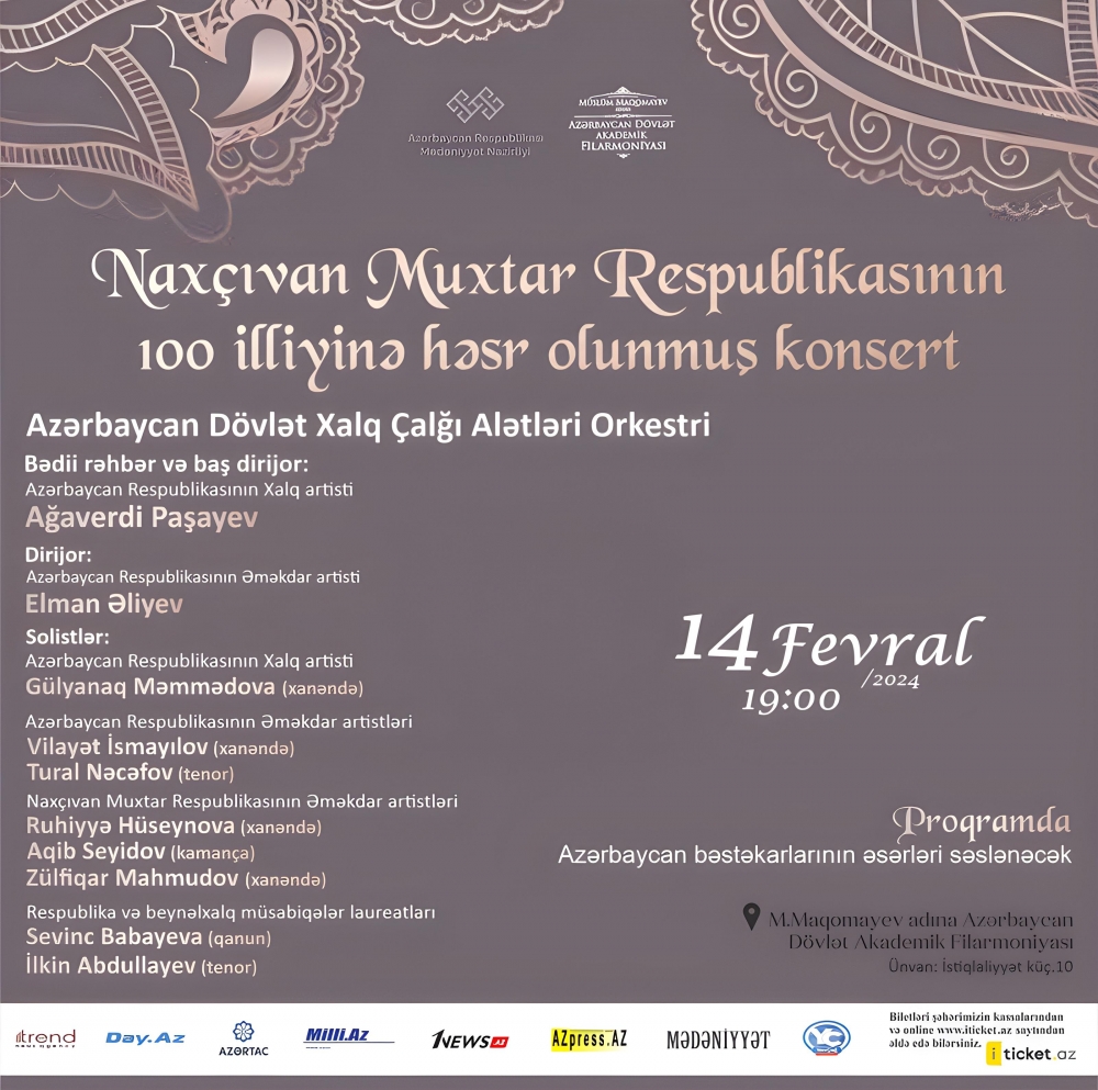 Fevralın 14-də Müslüm Maqomayev adına Azərbaycan Dövlət Akademik Filarmoniyasında Naxçıvan Muxtar Respublikasının yaradılmasının 100 illik yubileyi münasibəti ilə Naxçıvanın incəsənət nümayəndələrinin konserti keçiriləcək. Musiqili gecədə Azərbaycan bəstəkarlarının əsərləri səsləndiriləcək.