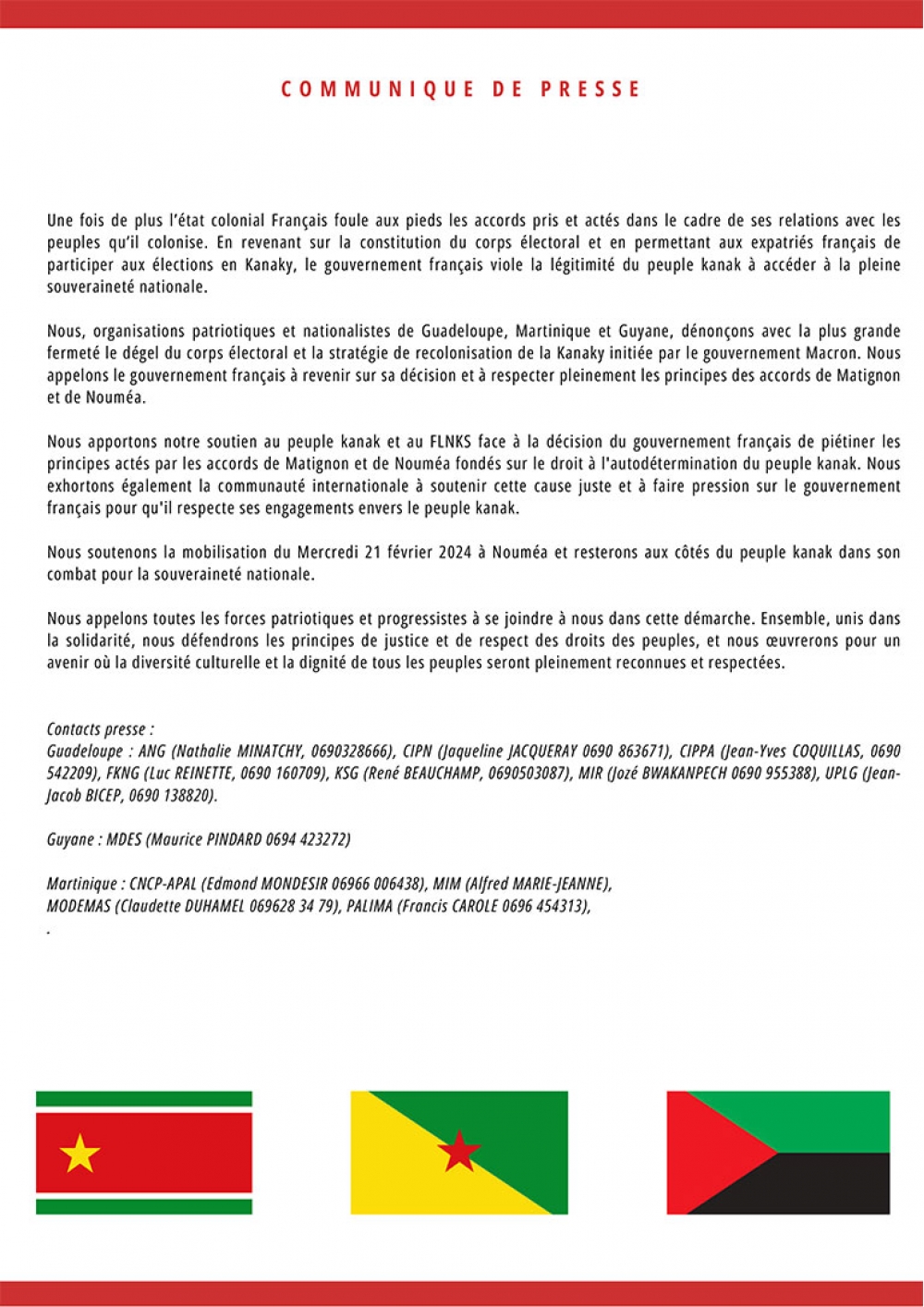 “Koloniyalar nazirinin” Kanak torpağına səfəri münasibəti ilə biz 21 fevralında Noumeada Kanak xalqının başladığı nümayişlərə və səfərbərliyinə tam dəstəyimizi bir daha ifadə edirik.