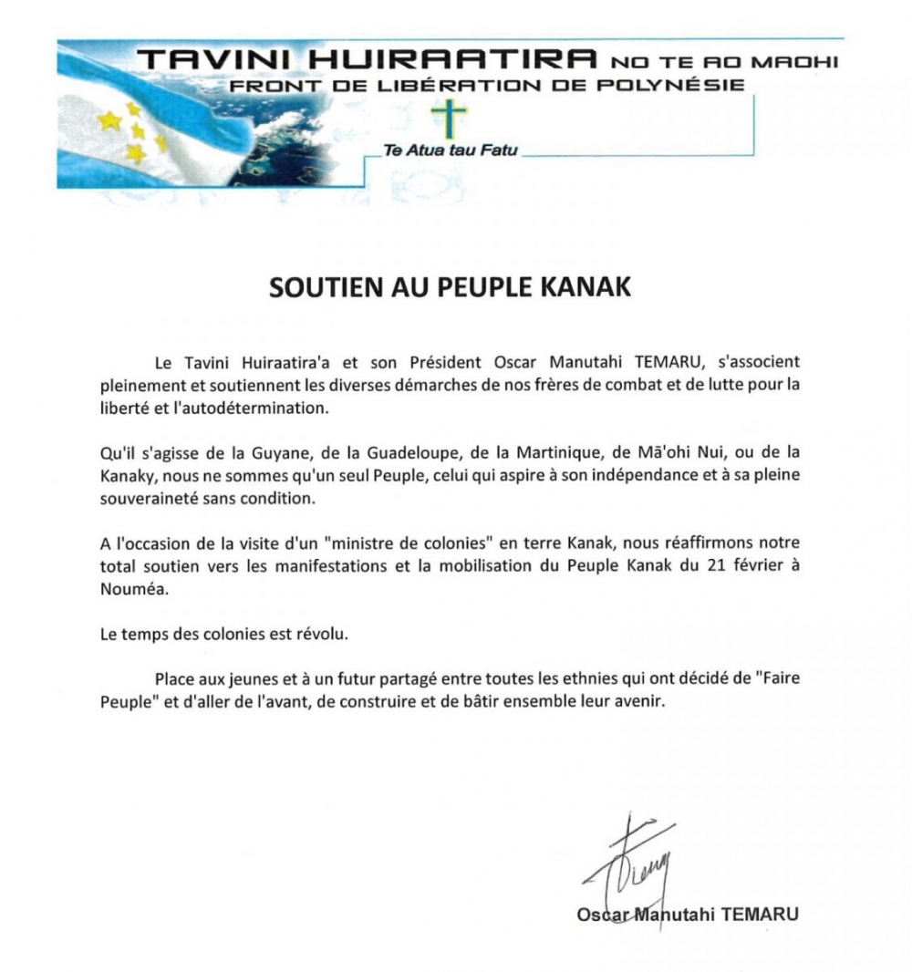Bəyanatda deyilir ki, Polineziyanın müstəqilliyi uğrunda mübarizə aparan “Tavini huiraatira” partiyasının rəhbəri, onun üzvləri azadlıq və öz müqəddəratını təyinetmə mübarizəsi aparanları tam şəkildə dəstəkləyir.