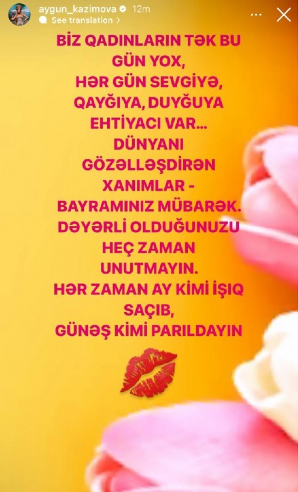 "Biz qadınların tək bu gün yox, hər gün sevgiyə, qayğıya, duyğuya ehtiyacı var. Dünyanı gözəlləşdirən xanımlar, bayramınız mübarək. Dəyərli olduğunuzu heç zaman unutmayın. Hər zaman ay kimi işıq saçıb, günəş kimi parıldayın".
