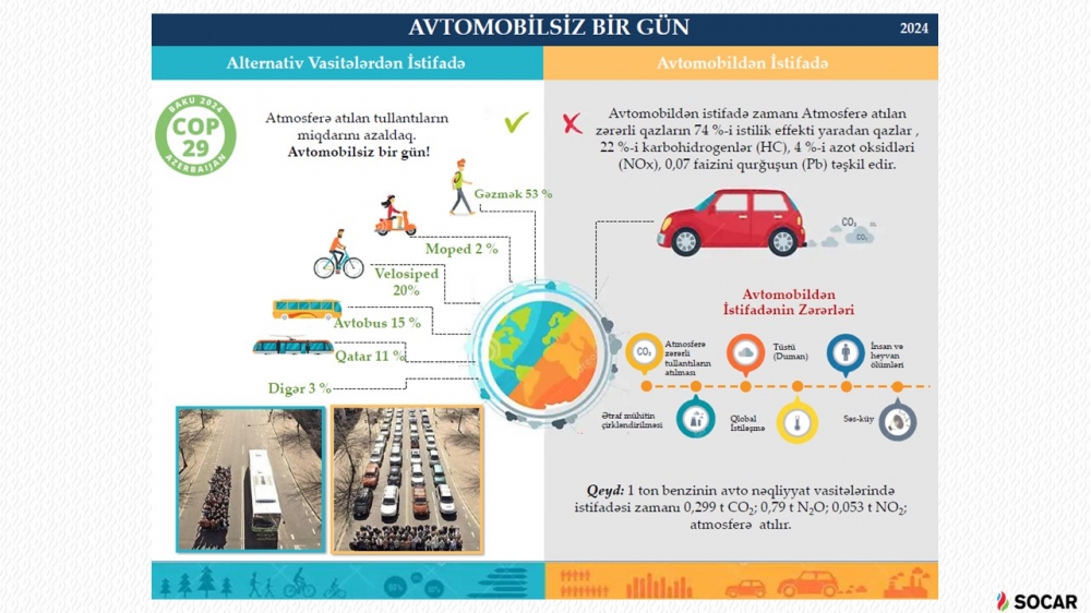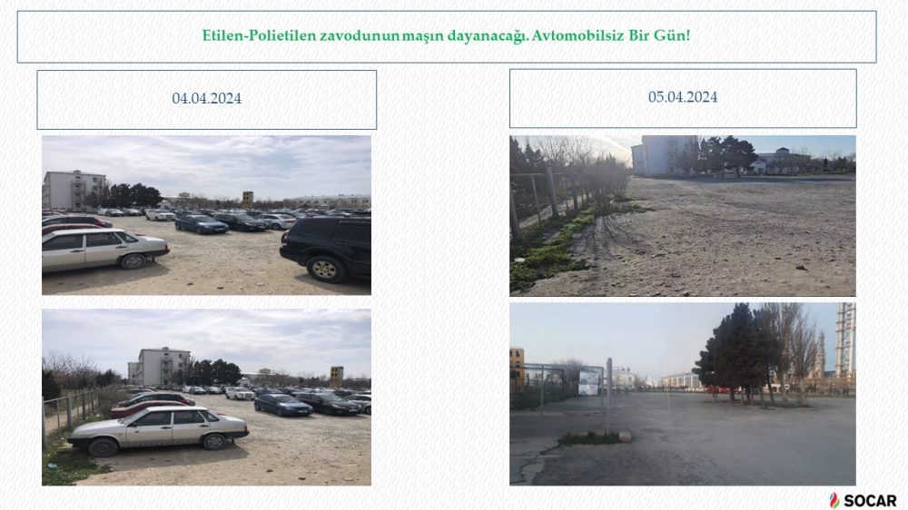 5 aprel 2024-cü il tarixində 2024-cü ilin Azərbaycan Respublikasında “Yaşıl dünya naminə həmrəylik ili” elan olunması və bununla əlaqədar hazırlanmış “Tədbirlər Planı”na uyğun olaraq SOCAR-ın “Azərikimya İB-nin idarəetmə aparatında, o cümlədən idarə və müəssisələrində atmosferə atılan istilik effektli qazların, karbon emissiyaların azaldılması məqsədilə “Avtomobilsiz bir gün” aksiyası keçirilmişdir.