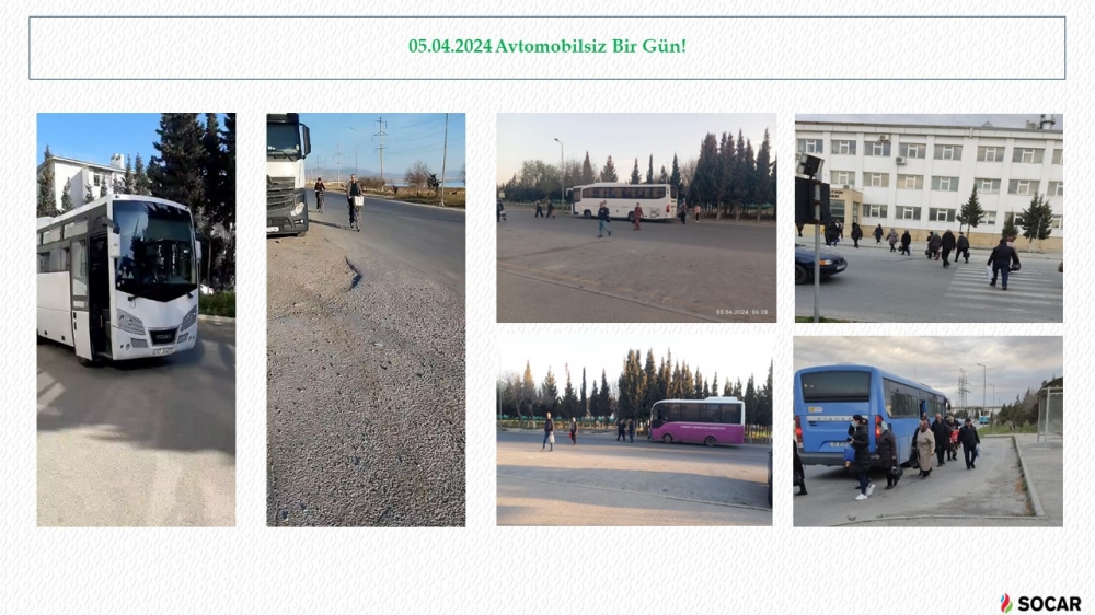 Aksiya çərçivəsində “Azərikimya”nın 250 nəfərdən artıq əməkdaşı şəxsi və xidməti avtomobillərdən bir günlük imtina etməklə, ictimai nəqliyyatlardan, elektromobillərdən, velosipedlərdən istifadə edərək, həmçinin piyada işə gəlmişlər.