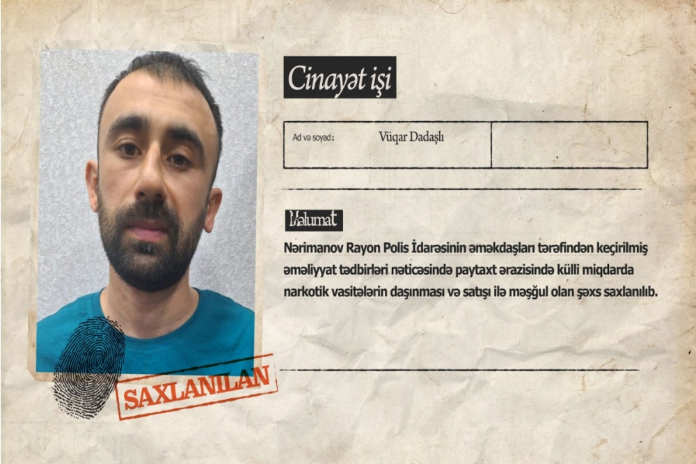 Nərimanov Rayon Polis İdarəsinin əməkdaşları tərəfindən keçirilmiş əməliyyat tədbirləri nəticəsində paytaxt ərazisində külli miqdarda narkotik vasitələrin daşınması və satışı ilə məşğul olmaqda şübləi bilinən 1993-cü il təvəllüdlü Vüqar Dadaşlı saxlanılıb.