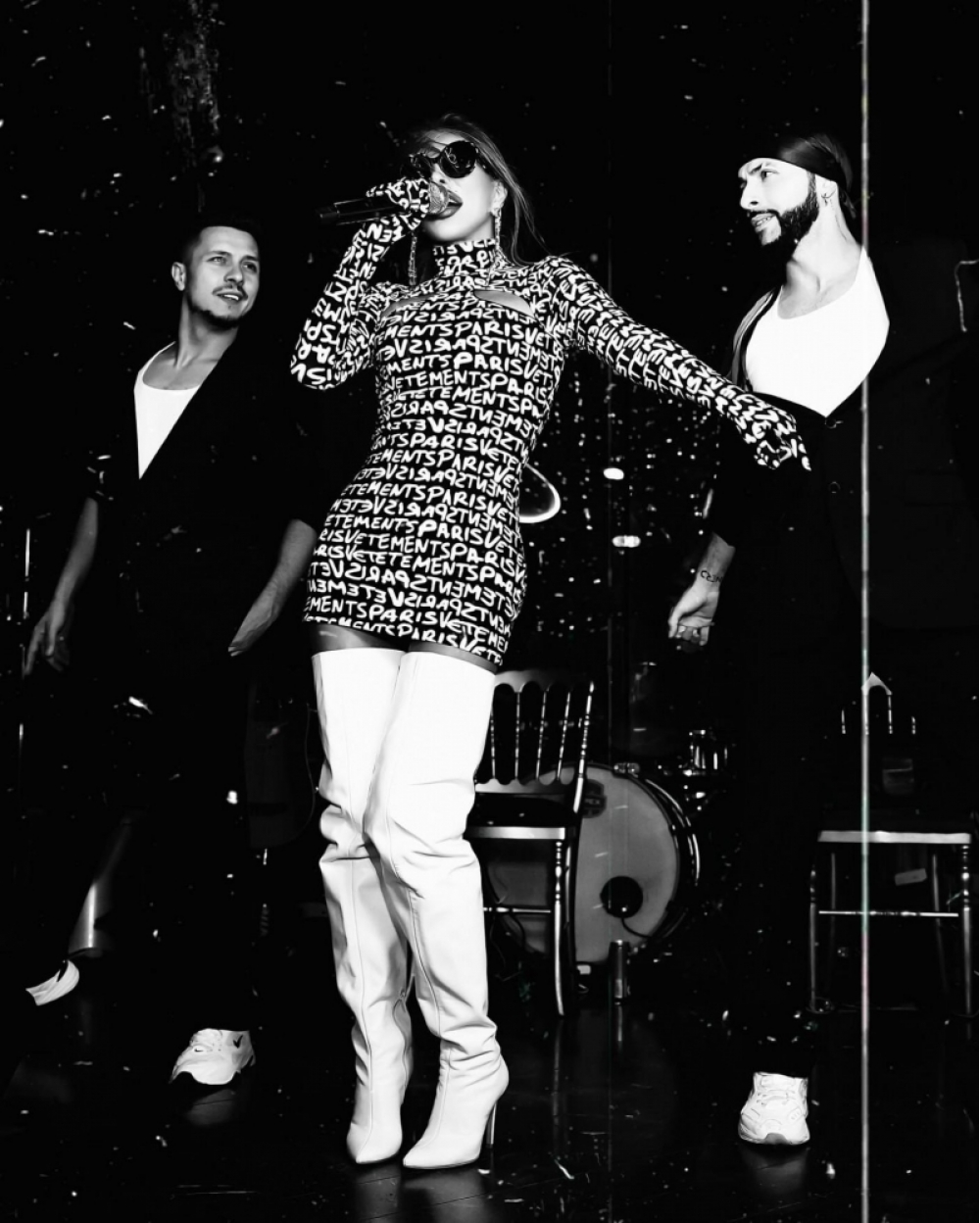 Pop kraliça "Vetements" brendindən qısa libas geyinib. Paltarın qiyməti 1375 dollar, yəni 2337 manatdır. Kazımova görünüşünü "Dolce & Gabbana" brendinə məxsus eynəklə tamamlayıb. Eynəyin qiyməti 425 dollar, yəni 722 manatdır.