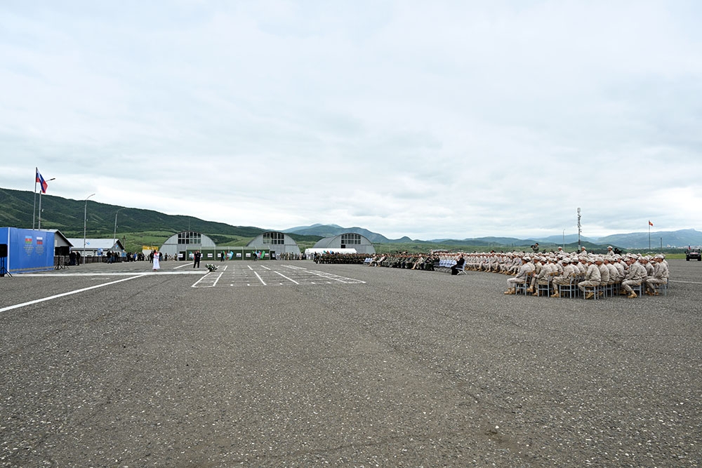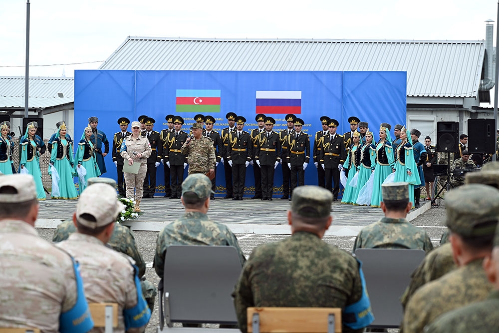 “İki sahil” xəbər verir ki, qonaqlar Rusiya Federasiyasının sülhməramlı kontingentinin Qarabağ iqtisadi rayonu ərazisində fəaliyyətini əks etdirən fotosərgi ilə tanış olduqdan sonra fəxri kürsüyə dəvət olunub və mərasimin proqramı elan edilib. Tədbirdə əvvəlcə həlak olan hərbi qulluqçuların xatirəsi bir dəqiqəlik sükutla yad edilib. Azərbaycan Respublikasının və Rusiya Federasiyasının Dövlət himnləri hərbi orkestrin müşayiəti ilə ifa olunub.