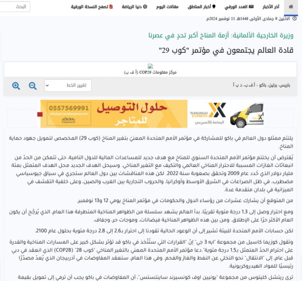 Səudiyyə Ərəbistanının nüfuzlu “Ər-Riyad” qəzeti isə oxucularını Almaniyanın xarici işlər naziri Annalena Berbokun açıqlamaları ilə tanış edib. Qəzetin “Dünya liderləri COP29 konfransında toplanırlar” başlıqlı məqaləsində BMT-nin illik iqlim konfransının inkişaf etməkdə olan ölkələrə istixana qazlarının emissiyalarını azaltmaq və iqlim dəyişikliyinə uyğunlaşmaq üçün yeni maliyyə yardımının hədəflənməsi ilə yekunlaşmalı olduğu diqqətə çatdırılıb. Qeyd olunub ki, yeni hədəf 2009-cu ildə qarşıya qoyulan və 2022-ci ildə çətinliklə reallaşdırılan yüz milyard dollarlıq hədəfi əvəz edəcək.