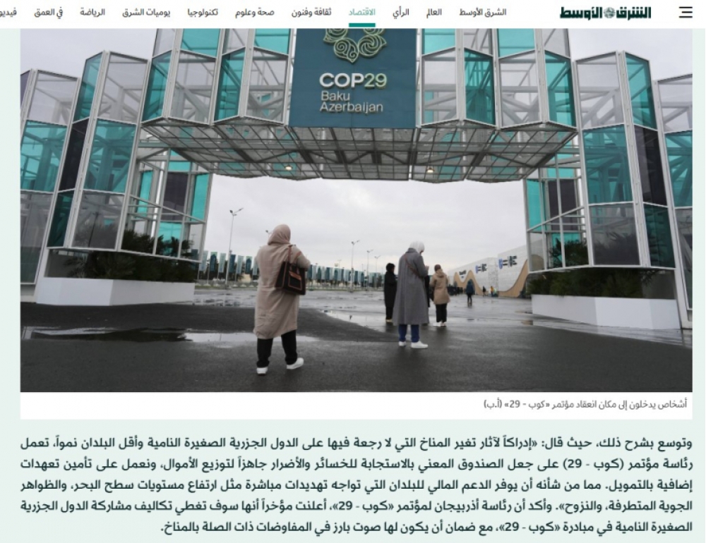 “İki sahil” xəbər verir ki, Krallığın Londonda nəşr olunan “Əş-Şərq Əl-Ausət” qəzetində “COP29-un müəyyən edilmiş Prezidenti: Biz ədalətli iqlim ambisiyaları və davamlı maliyyələşdirməni hədəfləyirik... və Səudiyyə Ərəbistanının səylərini yüksək qiymətləndiririk” başlıqlı məqalə dərc olunub. Məqalədə vurğulanıb ki, COP29-un Prezidenti Muxtar Babayev ambisiyaları artırmaq, 1,5 dərəcə hədəfinə nail olmaq və iqlim dəyişmələrinə qarşı fəaliyyətə imkan yaratmaq üçün konfransın aydın baxışa malik olduğunu diqqətə çatdırıb. Bildirilib ki, Azərbaycan rəsmisi Səudiyyə Ərəbistanının kritik iqlim problemlərinin həllində səylərini yüksək qiymətləndirib.
