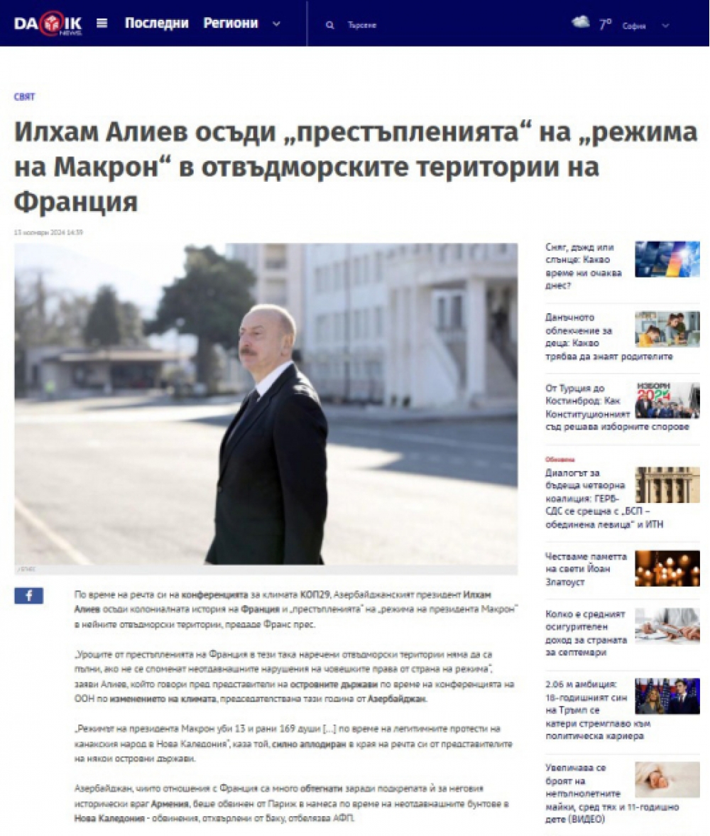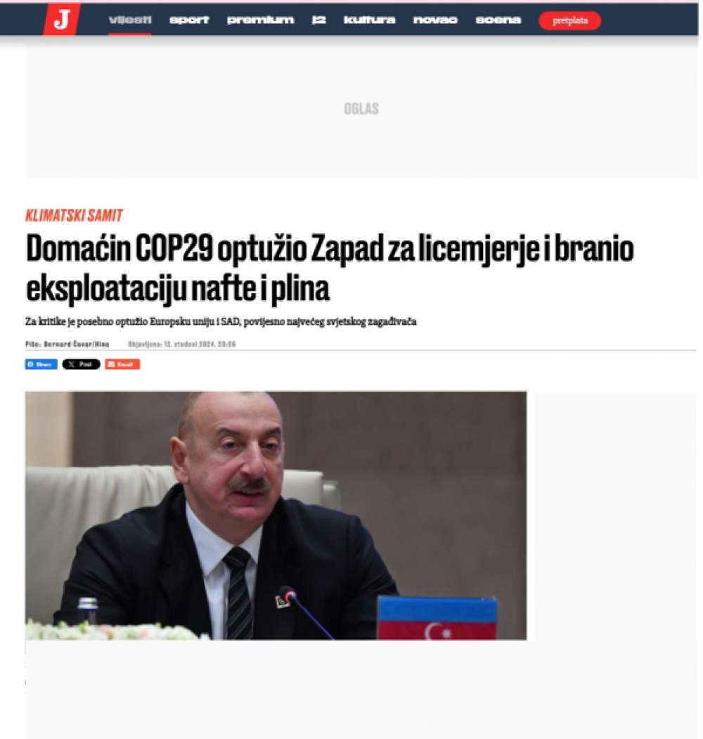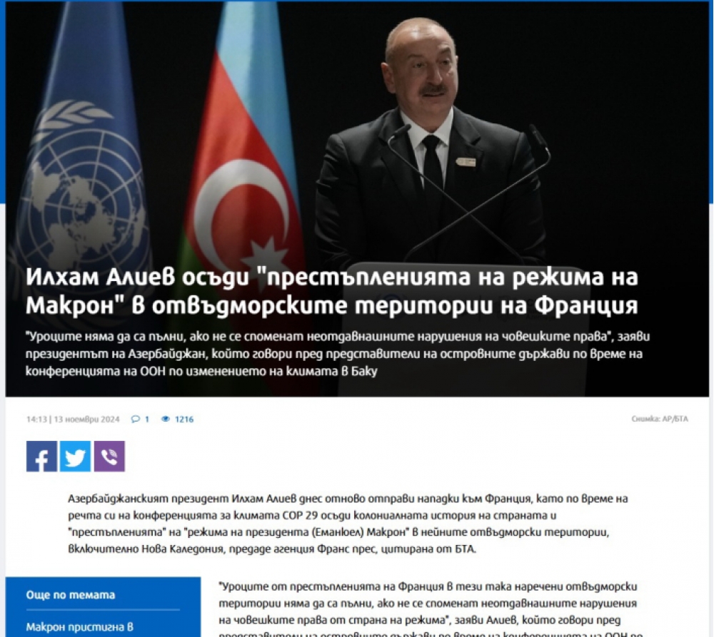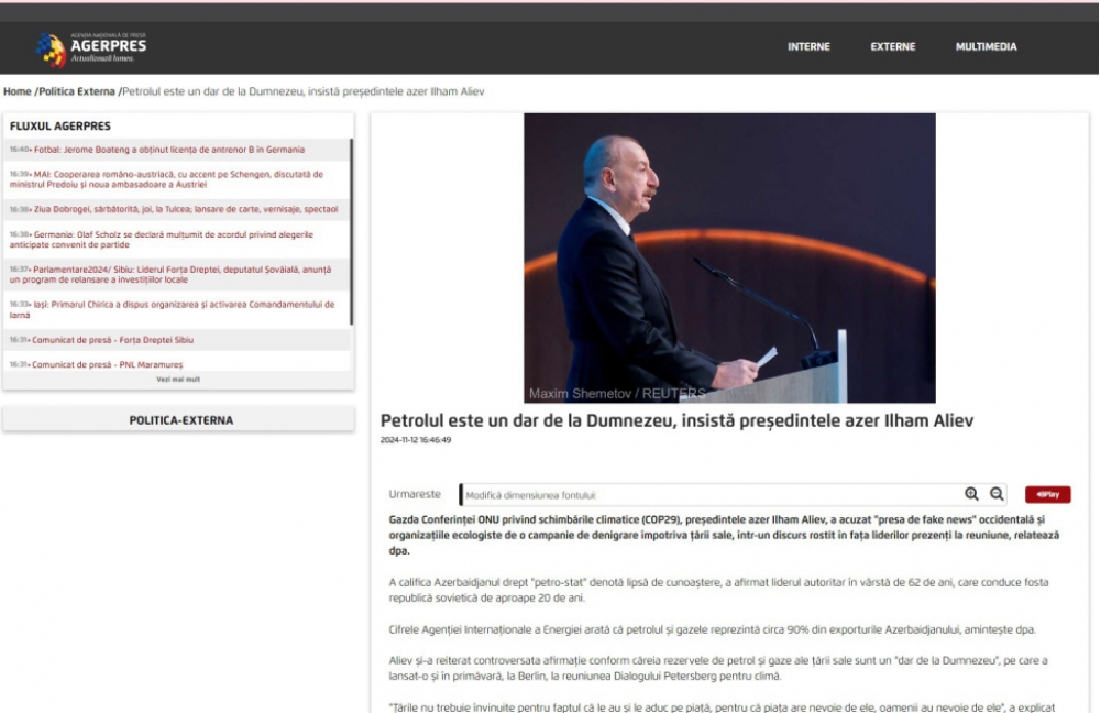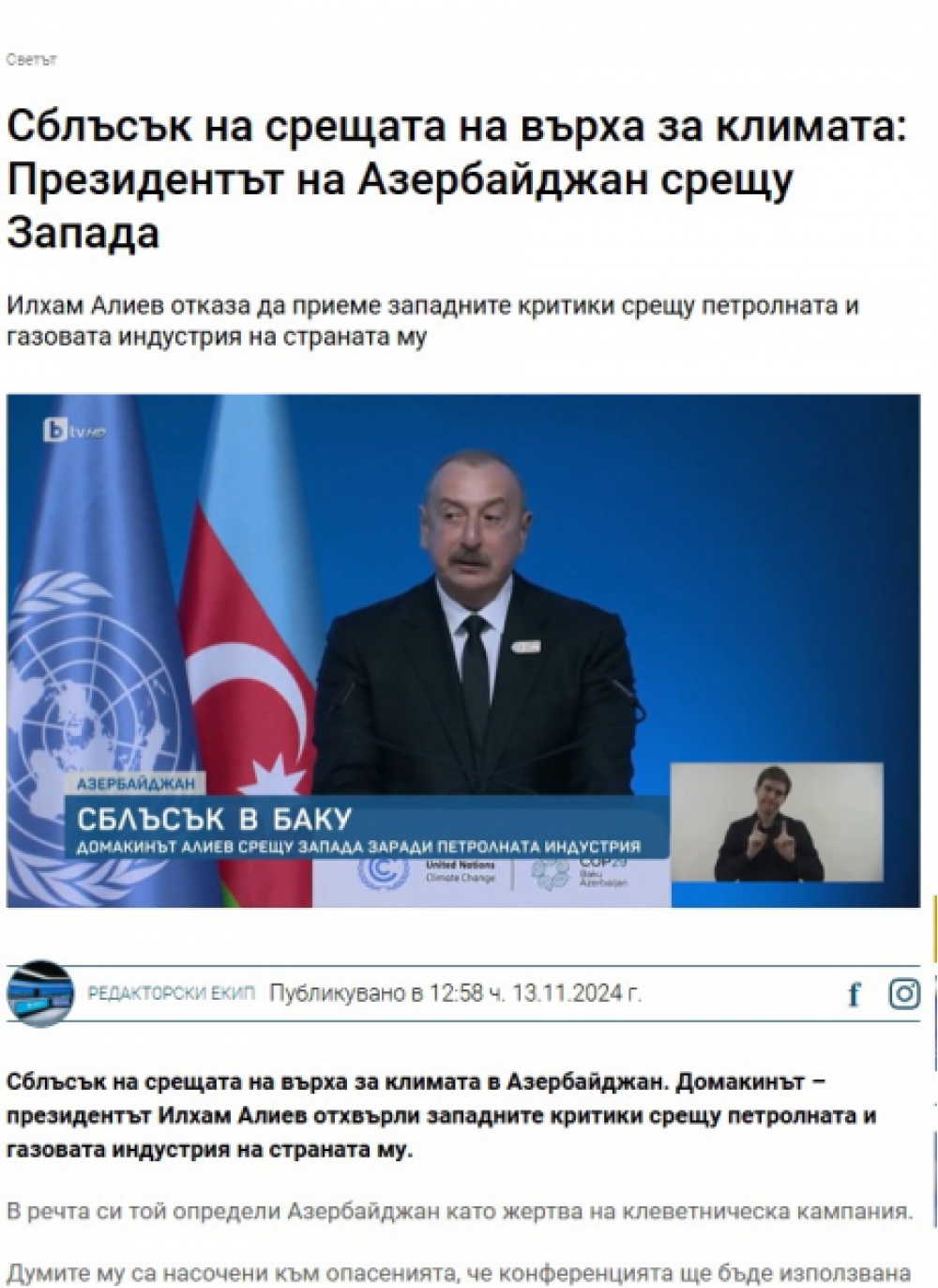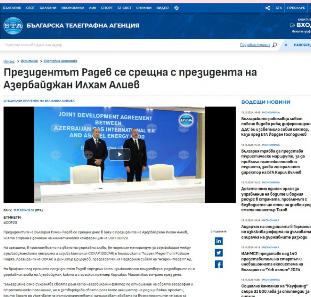 Azərbaycan və Bolqarıstan prezidentlərinin iştirakı ilə “SOCAR və “Asarel Energy” arasında Birgə İnkişaf Sazişi” imzalanması barədə bildirilib. Mətbu orqanlarının çoxu Azərbaycan Prezidenti İlham Əliyevin COP29-da çıxışını geniş yayıb. Xüsusilə Prezident İlham Əliyevin Liderlər Sammitinin açılış mərasimindəki çıxışında COP29-a ev sahibliyi edən ölkəmizə ünvanlanan tənqidlərə sərt cavab verdiyi vurğulanır. Dövlətimizin başçısının təbii sərvətlərin Tanrının bəxş etdiyi hədiyyə olduğunu vurğuladığı bildirilir.