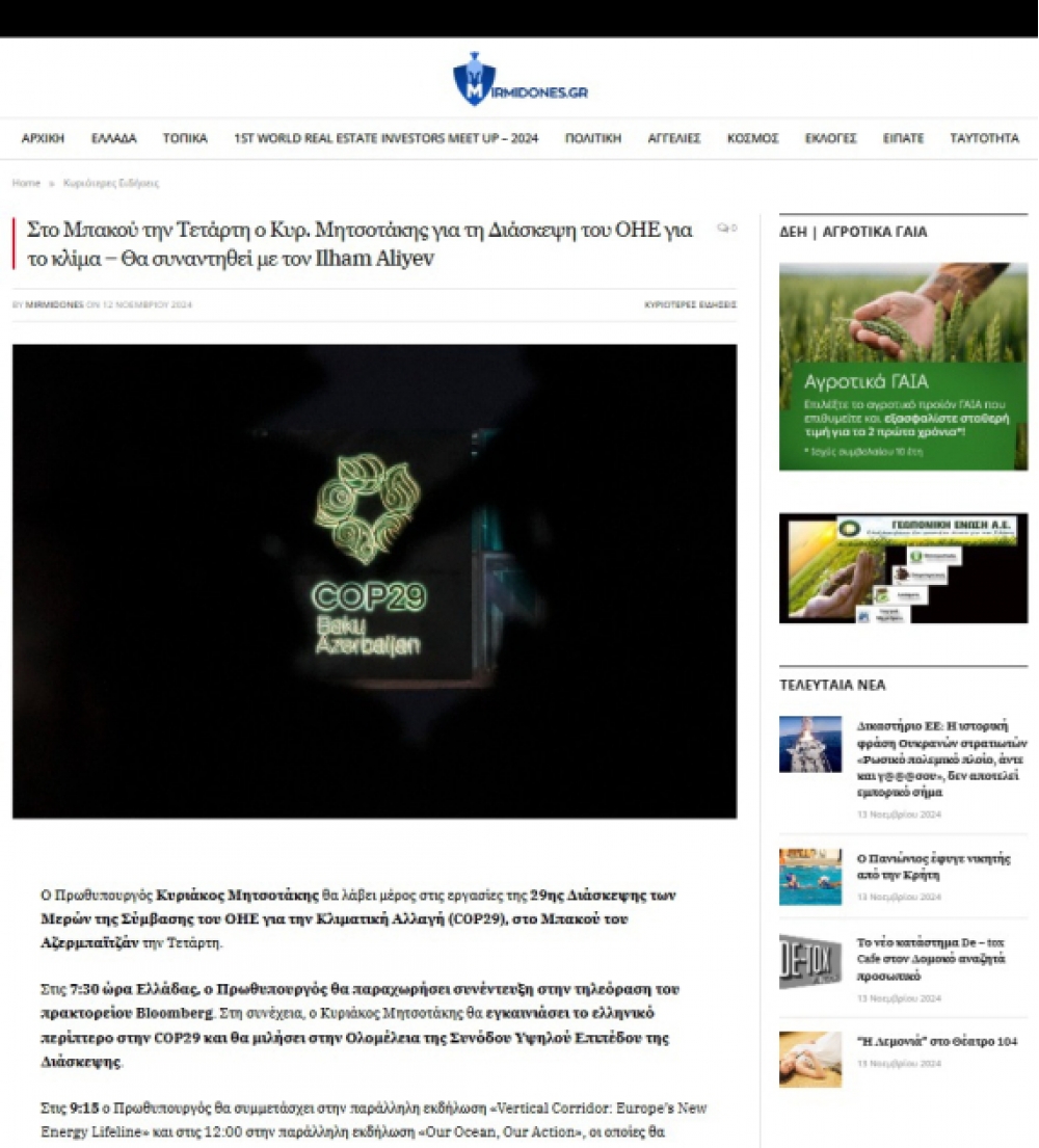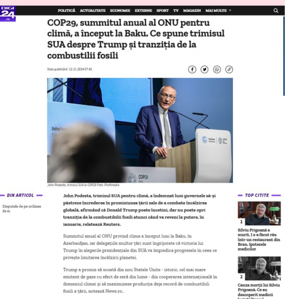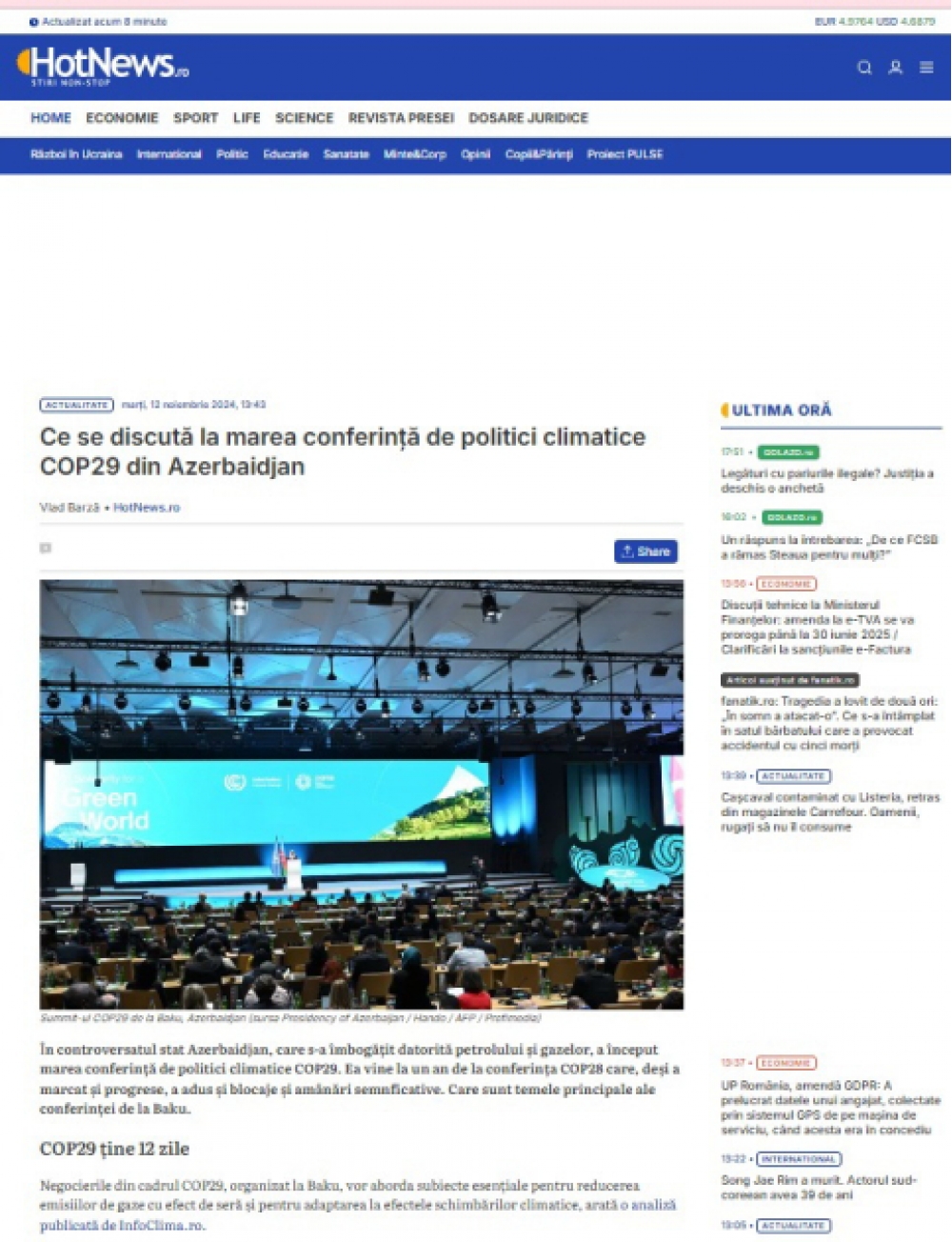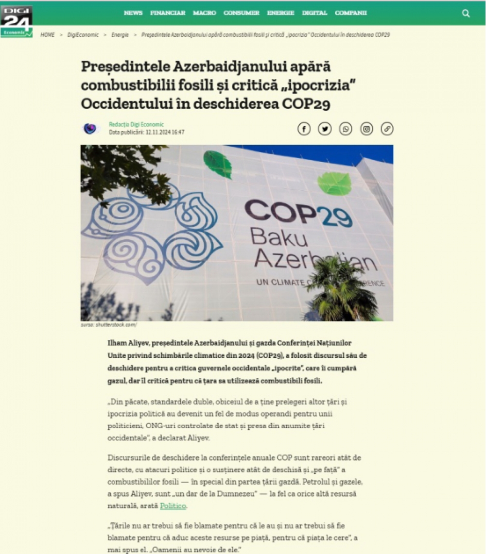 Rumıniya, Bolqarıstan, Xorvatiya və Yunanıstanın aparıcı mətbu orqanları Azərbaycanda keçirilən BMT-nin İqlim Dəyişmələri üzrə Çərçivə Konvensiyasının Tərəflər Konfransının 29-cu sessiyasını (COP29) diqqət mərkəzində saxlamaqda davam edir.