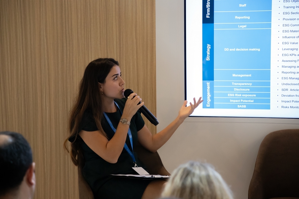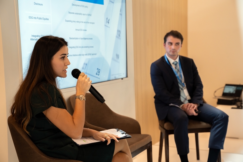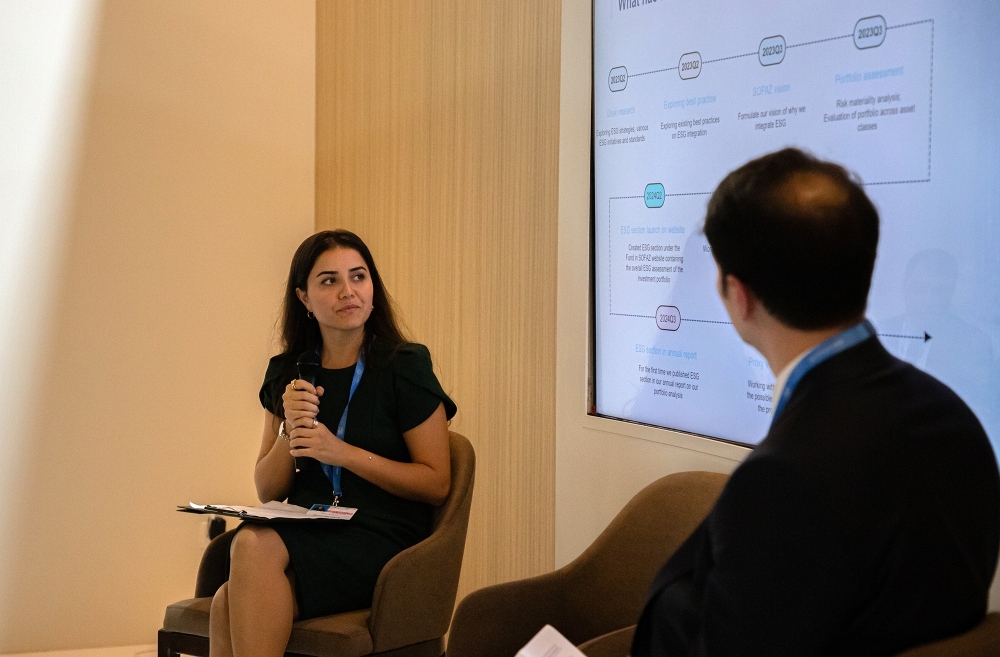 Tədbirdə ARDNF-nin dayanıqlılıq üzrə mütəxəssisləri - Nigar Əzizova, Alternativ investisiyalar üzrə baş təhlilçi və Əli Hüseynov, Alternativ risklər üzrə təhlilçi təqdimatla çıxış ediblər. Onlar ESG prinsiplərinin ARDNF-nin səhmlər və daşınmaz əmlak portfellərində tətbiq edilmə səbəblərinə dair dərin təhlil təqdim edərək, bu istiqamətdə indiyə qədər atılmış əsas addımlar haqqında tədbir iştirakçılarını məlumatlandırıb, o cümlədən iqlim dəyişikliyi və sosial bərabərsizlik kimi kritik problemlərin həlli və davamlı inkişaf yollarının müəyyənləşdirilməsi istiqamətində ARDNF-nin yanaşmasını izah ediblər.