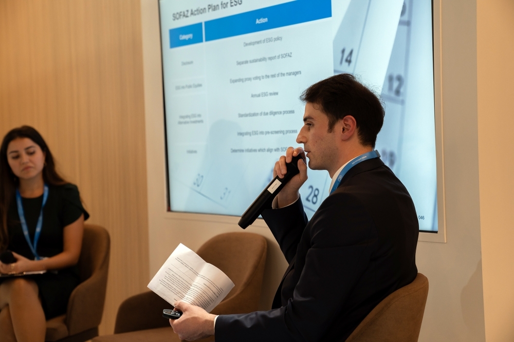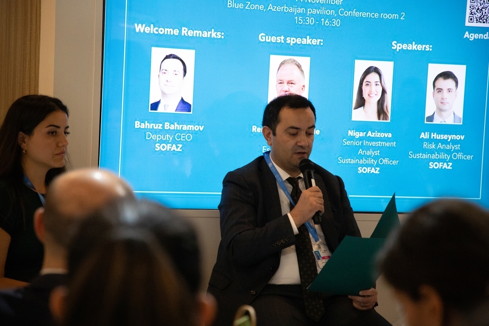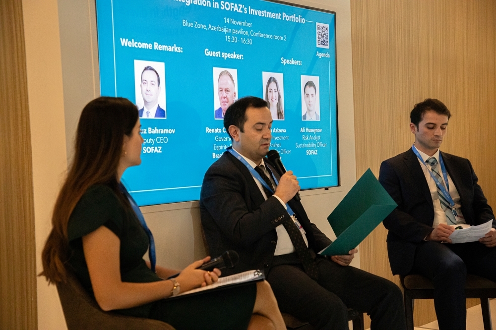 Azərbaycan Respublikası Dövlət Neft Fondu (ARDNF) COP29 çərçivəsində ESG (Ətraf Mühit, Sosial və İdarəetmə) prinsiplərinin Fondun investisiya portfelinə inteqrasiyası mövzusunda tədbir təşkil edib.