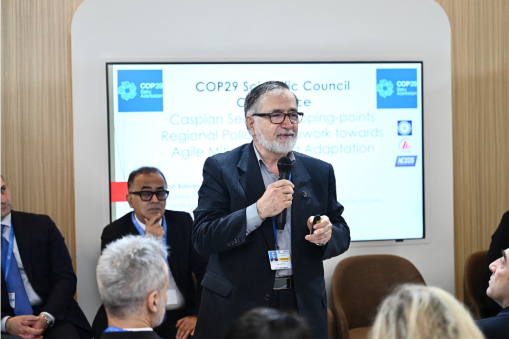 BMT-nin Ətraf Mühit - Tehran Konvensiyasının Katibliyindən Mahir Əliyev “Ətraf mühit Xəzər sessiyası üçün idarəetmə çərçivələri: irəli yol” adlı məruzə ilə çıxış edib. Bildirib ki, Xəzər dənizində suyun səviyyəsi narahatedici dərəcədə azalıb. Məruzəçi Xəzəryanı ölkələrin bu kritik vəziyyəti həll etməsi üçün bir araya gəlmələrinin vacibliyini qeyd edib.