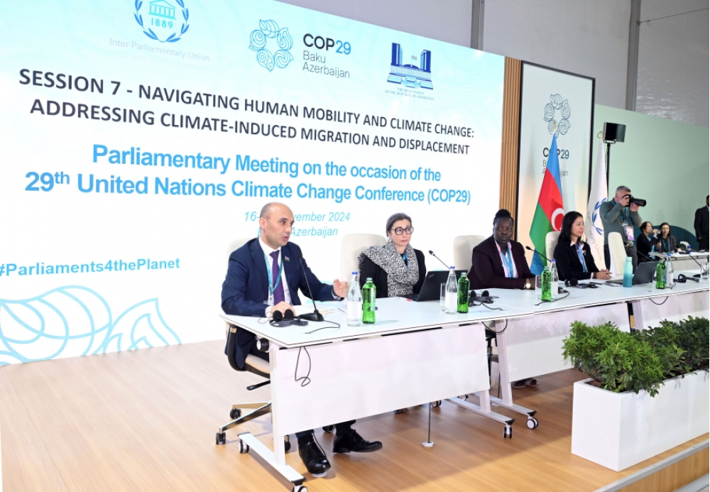 Bakıda keçirilən BMT-nin İqlim Dəyişmələri üzrə Çərçivə Konvensiyasının Tərəflər Konfransının 29-cu sessiyasında (COP29) Parlamentlərarası İttifaq və Milli Məclisin birgə təşkilatçılığı ilə Parlament Görüşünün ikinci günündə "İnsan mobilliyi və iqlim dəyişikliyinə gedən yol: iqlim səbəbindən miqrasiya və məcburi köçkünlüyün həlli" adlı sessiya keçirilib.