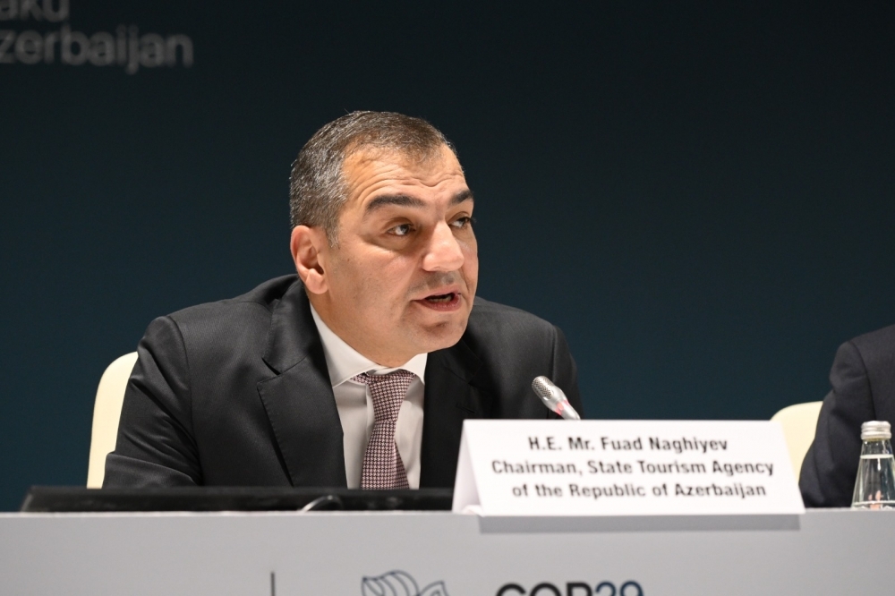 Tədbirdə çıxış edən Dövlət Turizm Agentliyinin sədri Fuad Nağıyev turizmin iqlim dəyişikliyindən təsirlənərək, həm də iqlim dəyişikliyinə töhfə verən bir sahə kimi qlobal iqlim dəyişikliyi ilə mübarizdə xüsusi rola malik olduğunu bildirib. O, görüşdə təqdim ediləcək “Turizm Sektorunda Təkmilləşdirilmiş İqlim Fəaliyyəti üzrə COP29 Bəyannaməsi”nin turizmin milli və qlobal iqlim strategiyalarına, həmçinin Milli Səviyyədə Müəyyən Edilmiş Töhfələrə inteqrasiyası üçün yol xəritəsi olduğunu bildirərək, dövlətləri və maraqlı tərəfləri bəyannaməyə qoşulmağa çağırıb. F.Nağıyev Azərbaycanın milli səviyyədə turizm sahəsində dayanıqlı təcrübələrin tətbiqində maraqlı olduğunu, dayanıqlı bir dünya üçün qlobal turizm sənayesinin əməkdaşlıq etməsinin vacibliyini vurğulayıb.