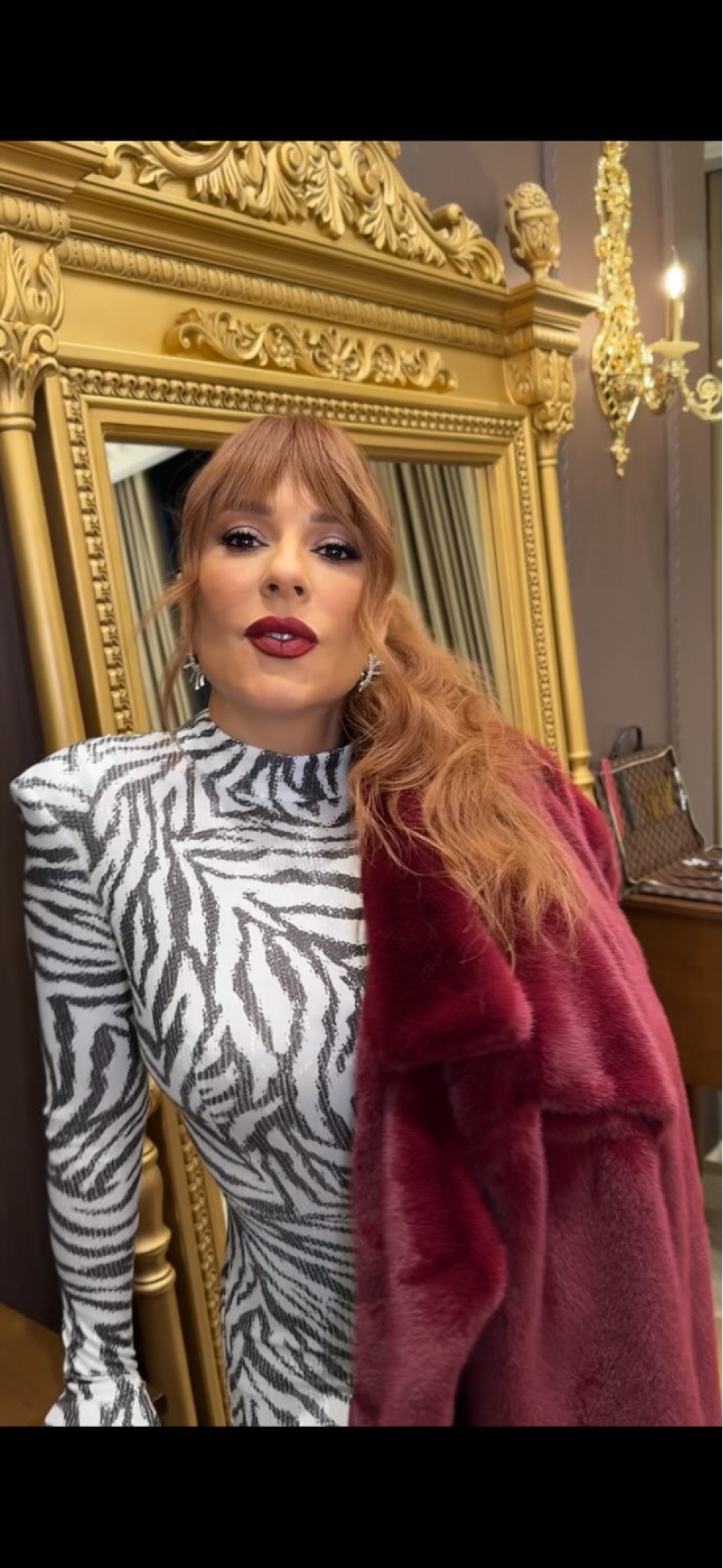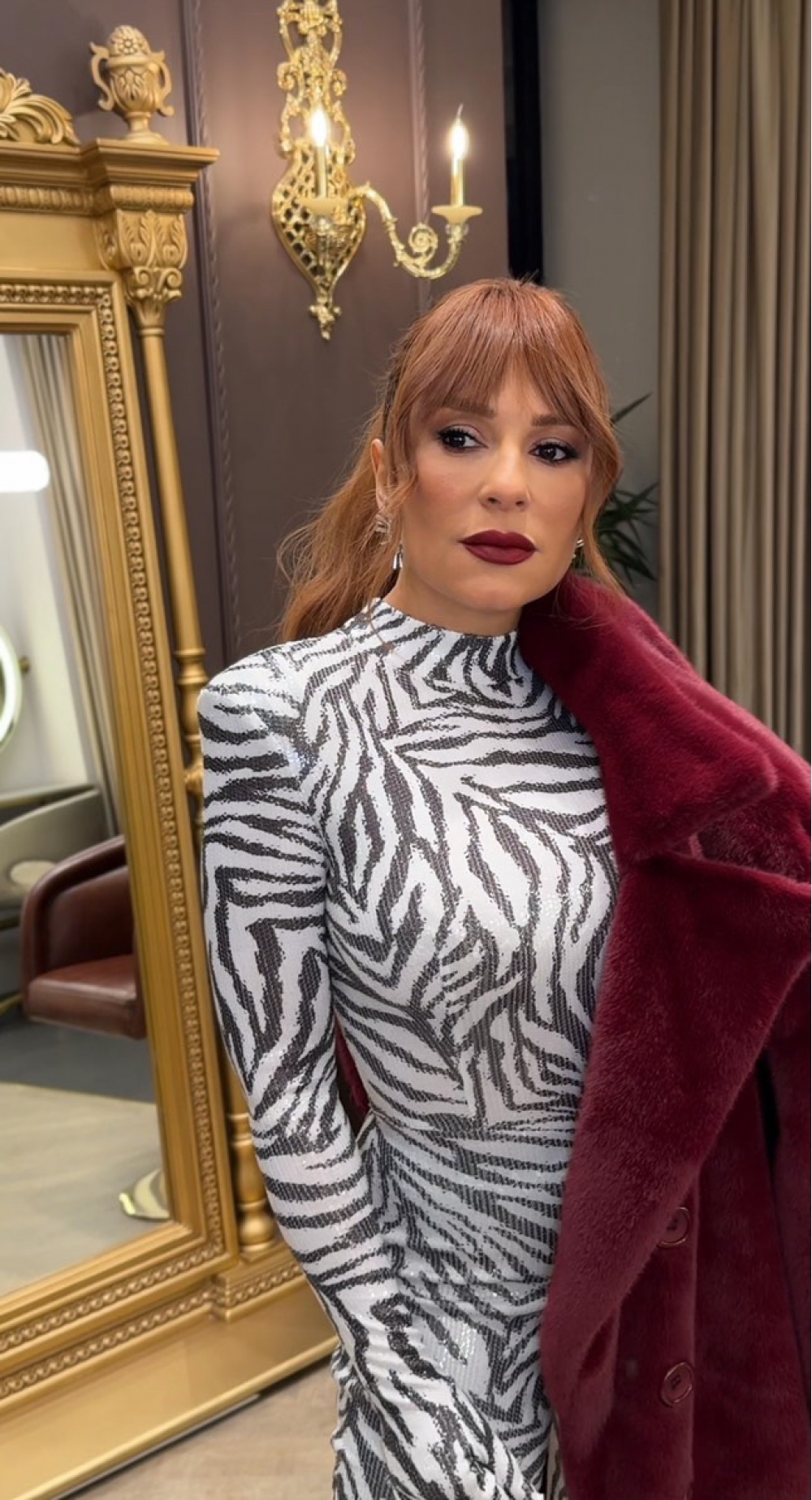 Hər zaman fərqli görünən estrada ulduzu bu dəfə ağ qara tonlarında olan tulum və bordo kürkdən istifadə edib.