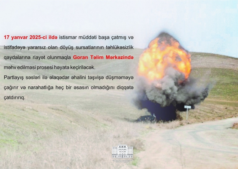Plana uyğun olaraq, yanvarın 17 -də istismar müddəti başa çatmış və istifadəyə yararsız olan döyüş sursatlarının təhlükəsizlik qaydalarına riayət olunmaqla Goran Təlim Mərkəzində məhv edilməsi prosesi həyata keçiriləcək.