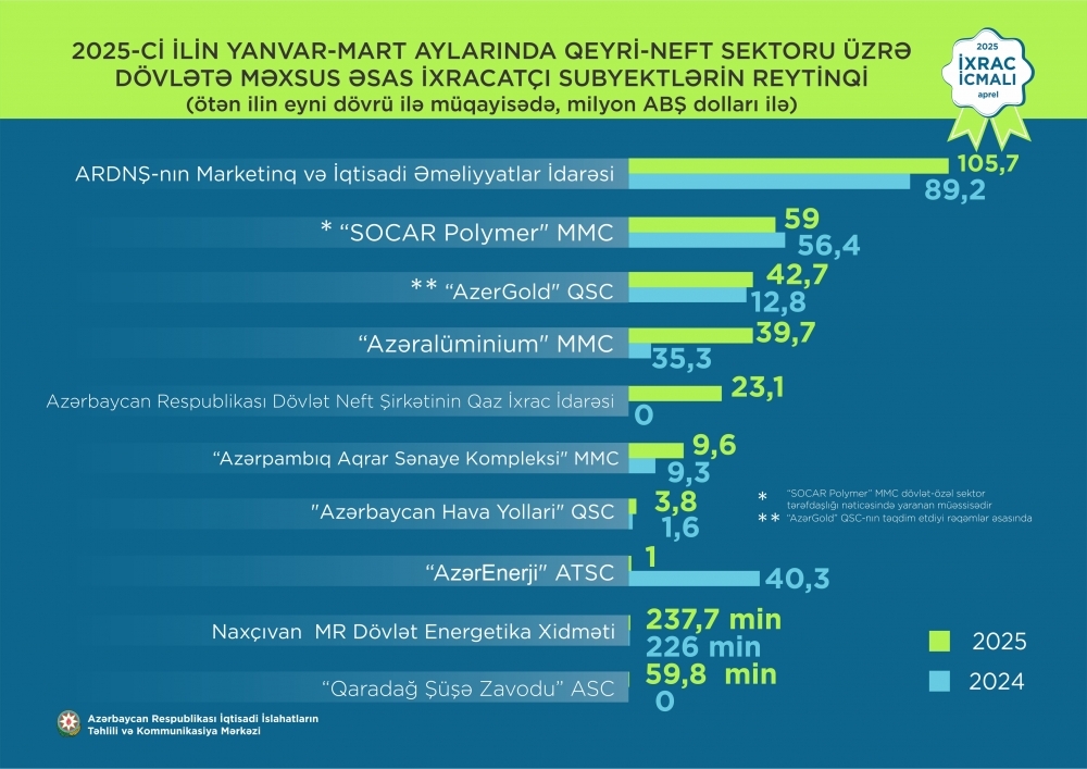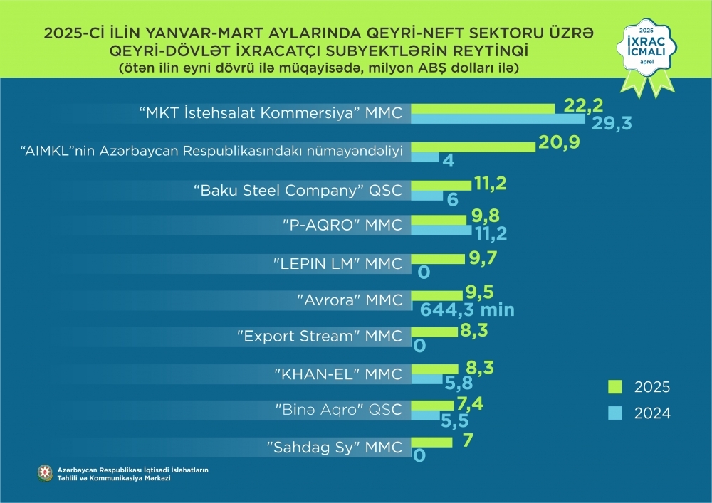 2025-ci ilin yanvar-mart ayları üzrə hazırlanmış qeyri-dövlət ixracatçı subyektlərin reytinqində ilk onluqda aşağıdakı şirkətlər təmsil olunublar: "MKT İstehsalat Kommersiya" MMC,"Azərbaycan İnterneyşnl Mayninq Kompani Limited Şirkəti"nin Azərbaycan Respublikasındakı Nümayəndəliyi,"Baku Steel Company" QSC,"P-AQRO" MMC,"LEPIN LM" Məhdud Məsuliyyətli Cəmiyyəti,"Avrora" Məhdud Məsuliyyətli Cəmiyyəti,"Export Stream" Məhdud Məsuliyyətli Cəmiyyəti,"KHAN-EL" MMC,"BİNƏ AQRO" QSC,"Sahdag Sy" Məhdud Məsuliyyətli Cəmiyyəti.