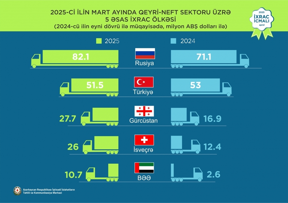 2025-ci ilin mart ayında Rusiya Federasiyasına 82,1 milyon ABŞ dolları, Türkiyəyə 51,5 milyon ABŞ dolları, Gürcüstana 27,7 milyon ABŞ dolları, İsveçrəyə 26 milyon ABŞ dolları, BƏƏ isə 10,7 milyon ABŞ dolları dəyərində qeyri-neft sektoruna aid mal ixrac edilib.
