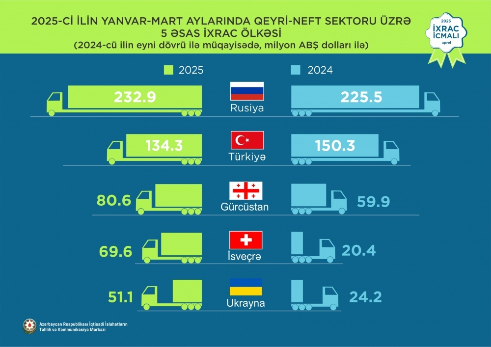 Cari ilin ilk üç ayında Rusiya Federasiyasına 232,9 milyon ABŞ dolları, Türkiyəyə 134,3 milyon ABŞ dolları, Gürcüstana 80,6 milyon ABŞ dolları, İsveçrəyə 69,6 milyon ABŞ dolları, Ukraynaya isə 51,1 milyon ABŞ dolları dəyərində qeyri-neft sektoruna aid mal ixrac olunub.