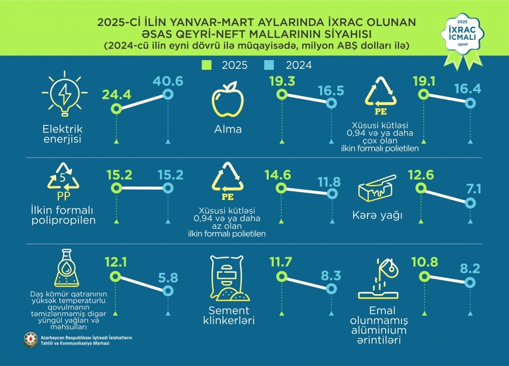 “İki sahil” xəbər verir ki, 2025-ci ilin yanvar-mart aylarında ixrac olunan qiymətli və ya azqiymətli daşlar və metallar ötən ilin müvafiq dövrünə nəzərən 46,7 milyon ABŞ dolları və ya 3,4 dəfə, qara metallar və onlardan hazırlanan məmulatlar 9,1 milyon ABŞ dolları və ya 76,8%, kimya sənayesi məhsulları 21,9 milyon ABŞ dolları və ya 33,4%, şəkər 976,3 min ABŞ dolları və ya 18,8%, meyvə-tərəvəz 20,8 milyon ABŞ dolları və ya 15,7%, alüminium və ondan hazırlanan məmulatlar 4,9 milyon ABŞ dolları və ya 10,2%, spirtli və spirtsiz içkilər 724 min ABŞ dolları və ya 5,7%, çay 74,1 min ABŞ dolları və ya 5,1%, bitki və heyvan mənşəli piylər və yağları 237,9 min ABŞ dolları və ya 4,2%, pambıq iplik 22,1 min ABŞ dolları və ya 0,4% artıb.