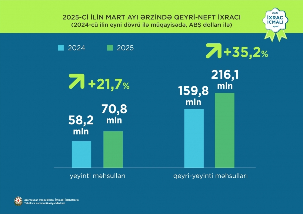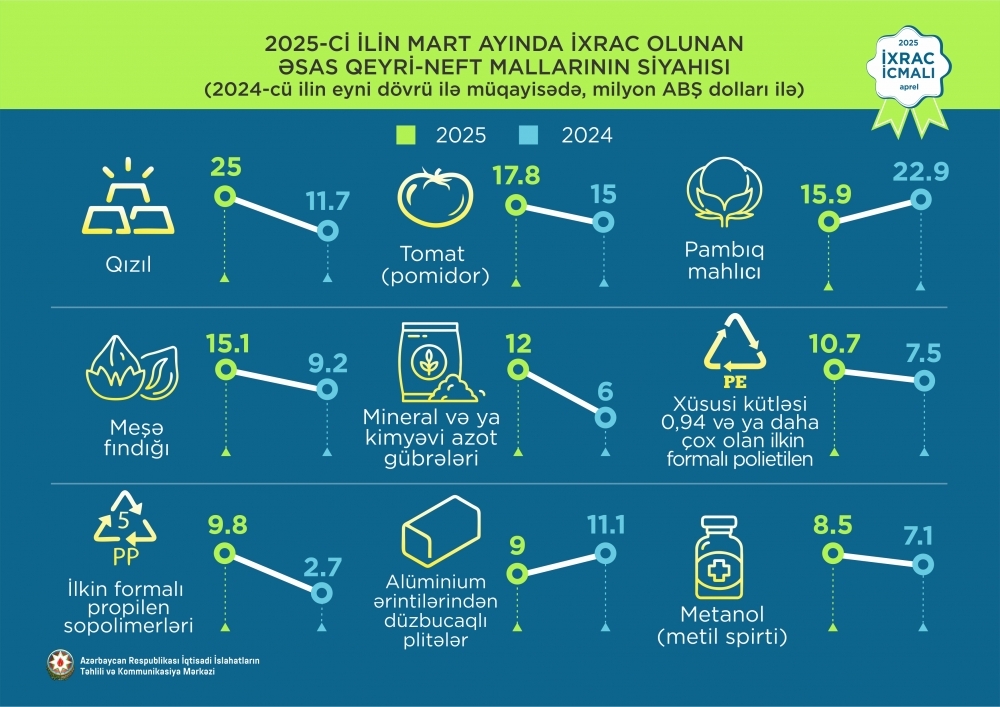 2025-ci ilin mart ayı ərzində ixrac edilmiş qeyri-neft sektoruna aid malların siyahısında qızıl (25 milyon ABŞ dolları) birinci olub. Bu siyahıda pomidor (tomat) (17.8 milyon ABŞ dolları) ikinci, pambıq (15,9 milyon ABŞ dolları) isə üçüncü yerdə qərarlaşıb.