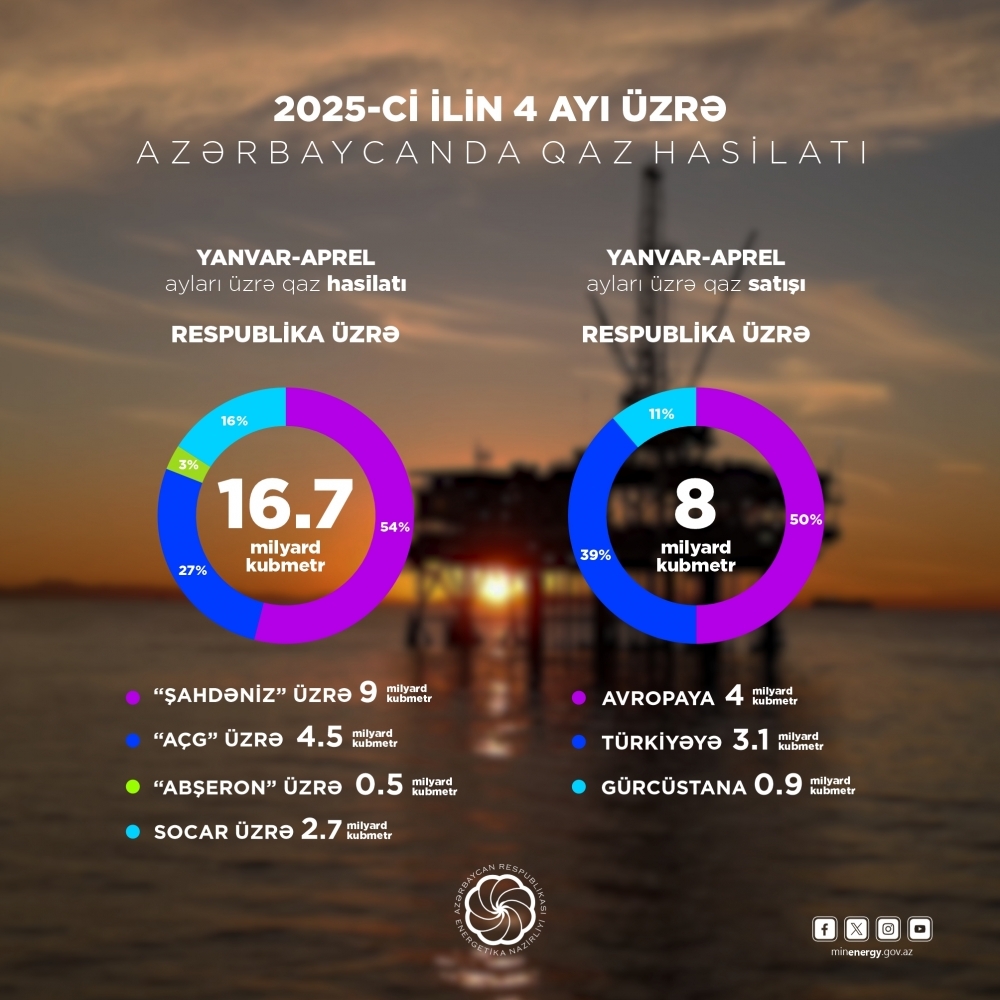 2025-ci ilin yanvar-aprel aylarında ölkədə 16,7 milyard kubmetr təbii qaz hasil edilib. Qazın 4,5 milyard kubmetri “Azəri-Çıraq-Günəşli”nin, 9 milyard kubmetri “Şahdəniz”in, 0,5 milyard kubmetri “Abşeron” yatağının, 2,7 milyard kubmetrə yaxını isə SOCAR-ın payına düşüb.