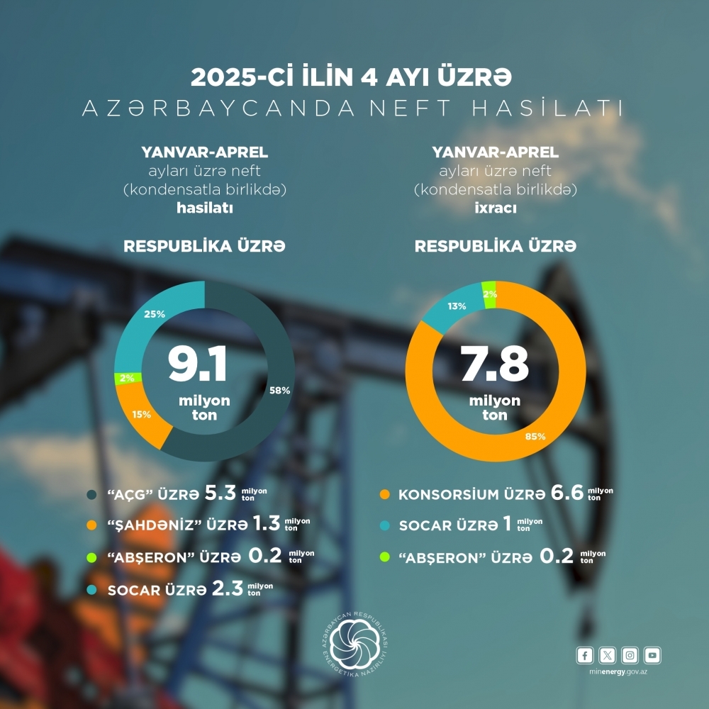2025-ci ilin yanvar-aprel ayları üzrə operativ məlumatlara əsasən, 4 ayda respublikada 9,1 milyon ton neft (kondensatla birlikdə) hasil edilib. Hasilatın 5,3 milyon tonu “Azəri-Çıraq-Günəşli”nin, 1,3 milyon tonu (kondensat) “Şahdəniz”in, 0,2 milyon tonu (kondensat) “Abşeron” yatağının payına düşüb. SOCAR üzrə neft (kondensatla birlikdə) hasilatı 2,3 milyon ton təşkil edib.