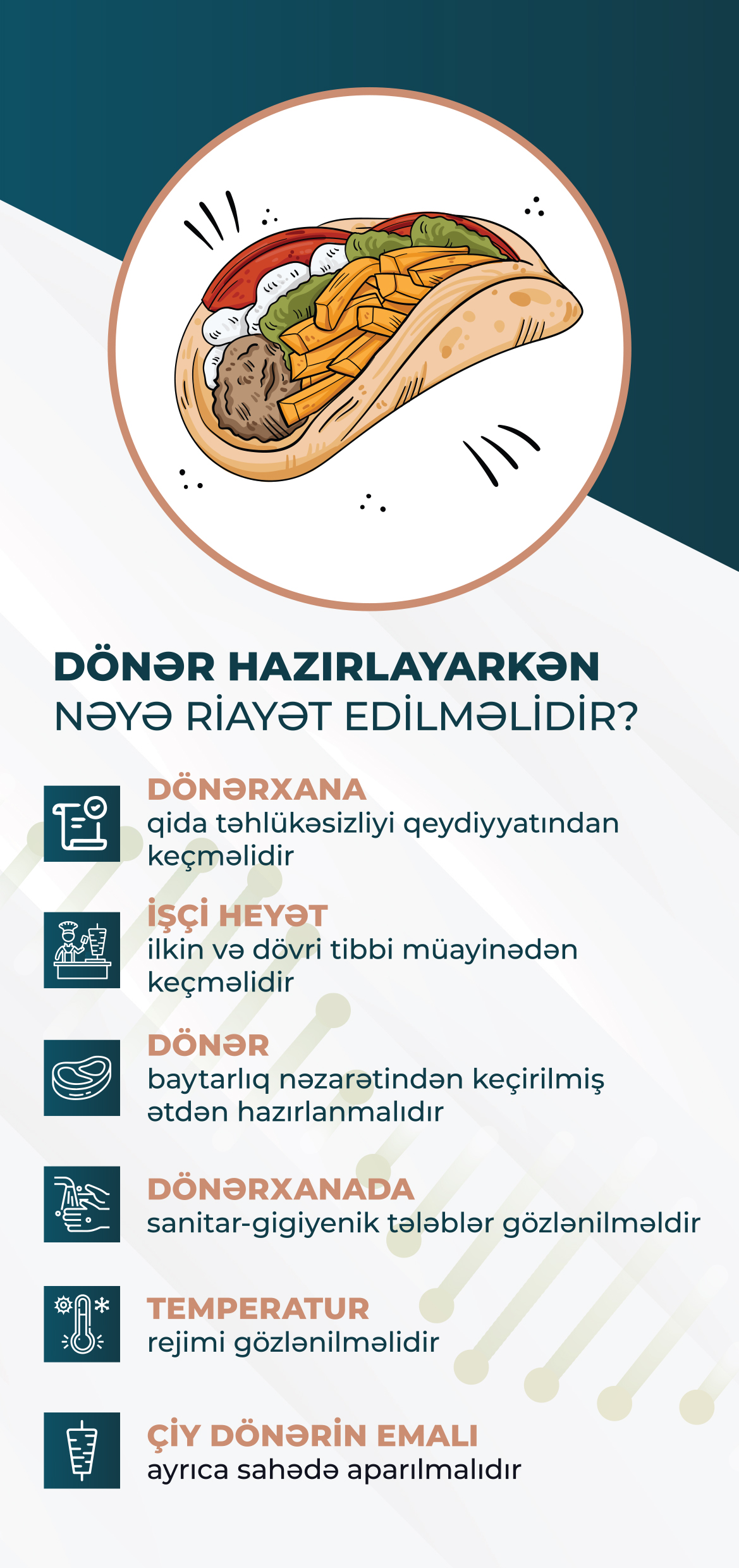 Qanunvericiliyə əsasən, ictimai iaşə obyektlərində, o cümlədən dönər istehsalı və satışı ilə məşğul olan müəssisələrdə qida məhsullarının təhlükəsizliyi ilə bağlı tələblərə ciddi şəkildə əməl edilməlidir. Dönər üçün istifadə olunan ət mütləq baytarlıq-sanitariya ekspertizasından keçirilməlidir. Ət məhsulları +4°C-dən yuxarı temperaturda uzun müddət saxlanmamalıdır. Bu mikrobioloji çirklənmə riskinin qarşısını almaq baxımından olduqca vacibdir.