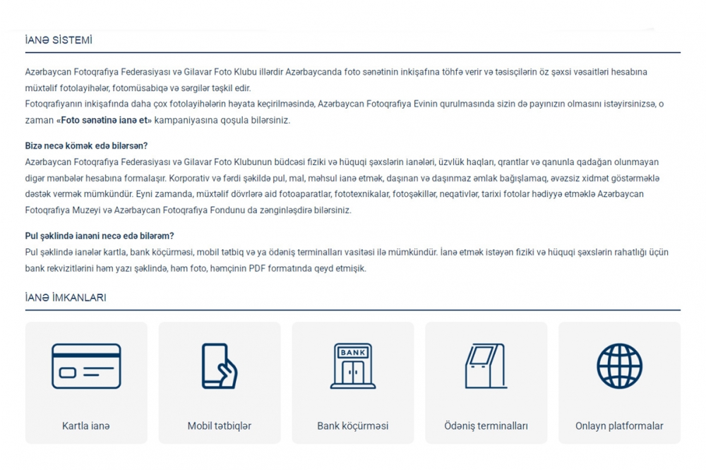 Ölkənin aparıcı foto təşkilatları Azərbaycan Fotoqrafiya Federasiyası və “Gilavar Foto Klubu” ictimai birliyi tərəfindən “Foto sənətinə ianə et” kampaniyasına başlanılıb.