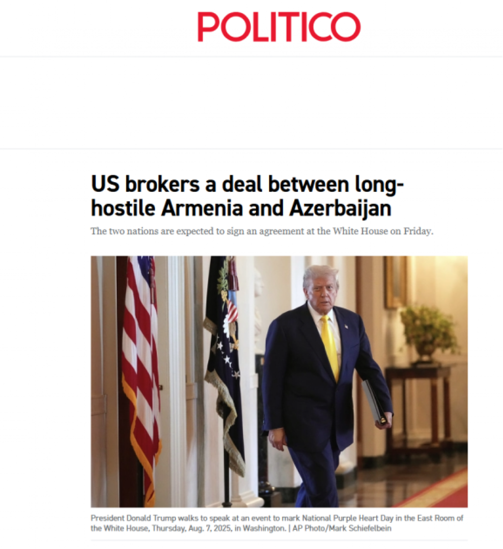 “The Washington Post” qəzetinin dərc etdiyi məqalədə qeyd olunur ki, Ermənistan və Azərbaycan rəsmilərinin Ağ evdə ABŞ-a strateji tranzit dəhlizinə müstəsna inkişaf hüququ verən sülh sazişi imzalayacağı gözlənilir. Ermənistanın baş naziri Nikol Paşinyan və Azərbaycan Prezidenti İlham Əliyev cümə günü Ağ evə gəlməyə hazırlaşır. ABŞ rəsmiləri “Reuters” agentliyinə bildiriblər ki, “Beynəlxalq sülh və rifah üçün Tramp marşrutu” adlanan pakt Azərbaycanı Ermənistan vasitəsilə Azərbaycanın eksklavı olan Naxçıvanla birləşdirəcək və ABŞ-a inkişaf hüququ verən sənəd olacaq.