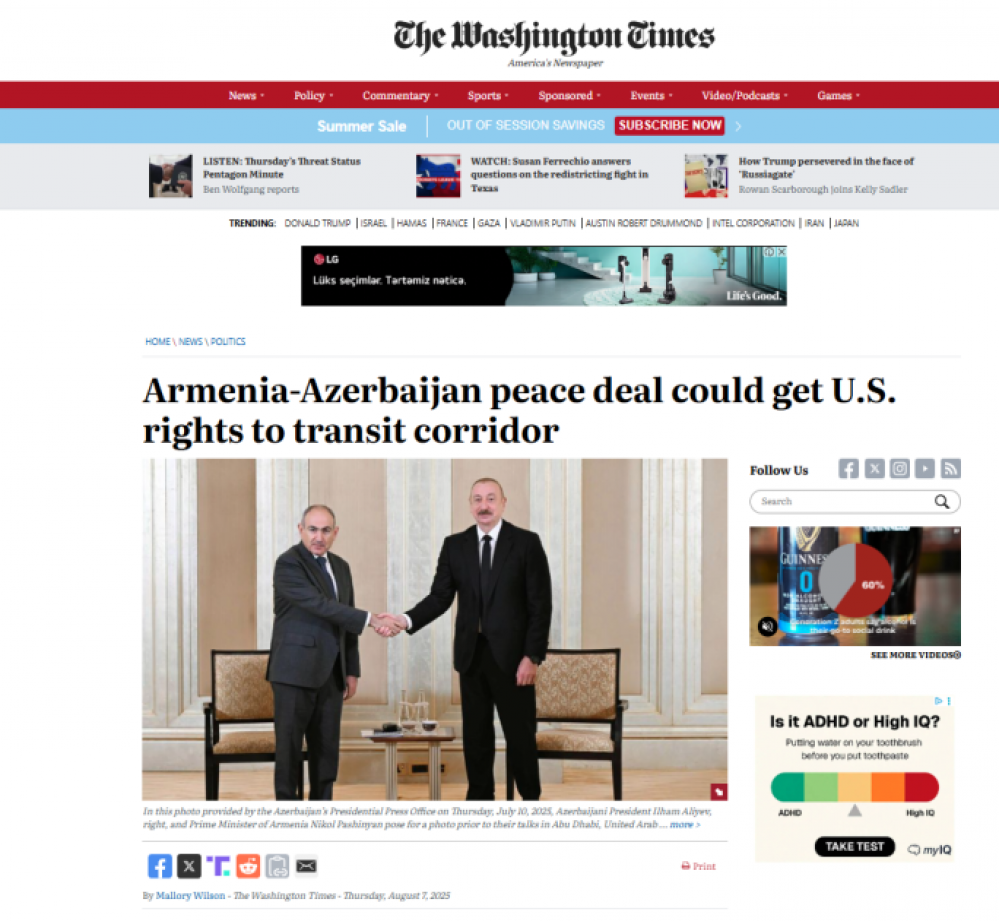 “The Hill” nəşri Azərbaycan Prezidenti İlham Əliyev və Ermənistanın baş naziri Nikol Paşinyanın Vaşinqton görüşünü tarixi hadisə adlandırıb və qeyd edib ki, Prezident Donald Tramp uzun illərdir düşmən olan bu iki ölkə arasında sülh nail olunması səylərini yüksək qiymətləndirir. İmzalanması gözlənilən razılaşma ABŞ-ın iki ölkənin Sovet İttifaqından müstəqillik əldə etdikdən sonra yaranan münaqişəyə son qoymaq üçün onilliklər ərzində göstərdiyi səylərin kulminasiya nöqtəsidir. Vaşinqton Azərbaycanın əsas hissəsini Naxçıvan eksklavı ilə birləşdirəcək “Beynəlxalq sülh və rifah üçün Tramp marşrutu” adlanan dəhlizə böyük əhəmiyyət verir. Ermənistan ABŞ-a Zəngəzur dəhlizinin 99 il müddətinə eksklüziv xüsusi inkişaf hüquqlarının verilməsinə razılıq verib. ABŞ torpağı dəmir yolu, neft, qaz və fiber-optik xətləri və 27 millik dəhliz boyunca elektrik enerjisinin ötürülməsini inkişaf etdirəcək konsorsiuma subicarəyə verəcək.