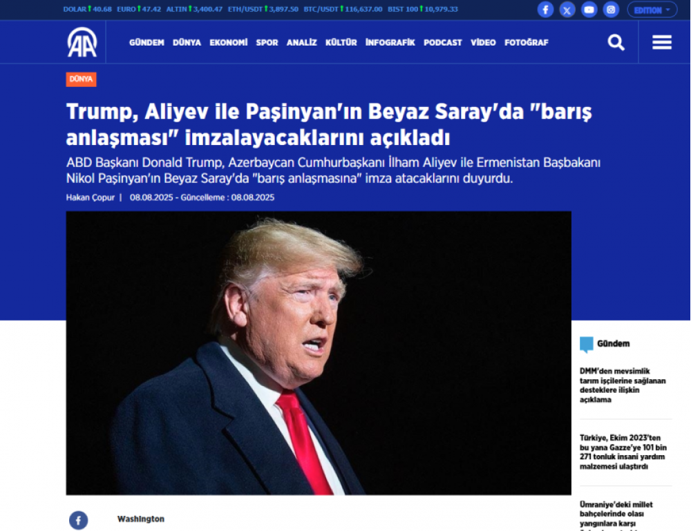 Türkiyənin Anadolu agentliyinin Vaşinqton müxbirinin məqaləsində qeyd olunub ki, Donald Tramp avqustun 7-də verdiyi açıqlamada Azərbaycan Prezidenti İlham Əliyev və Ermənistanın baş naziri Nikol Paşinyanı Ağ evdə qarşılayacağını səbirsizliklə gözlədiyini açıqlayıb. O qeyd edib: “Sabah (avqustun 8-də-red.) rəsmi sülh sazişi ilə bağlı sənədə imza atacaqlar”. ABŞ Prezidenti iki ölkənin uzun illərdir müharibə vəziyyətində olduğunu diqqətə çatdıraraq deyib: “Ermənistan və Azərbaycan xalqları üçün doğru olanı edən cəsur liderlərlə qürur hissi keçirirəm. Bu, Ermənistan, Azərbaycan, ABŞ, həmçinin dünya tarixi üçün tarixi bir gün olacaq”.