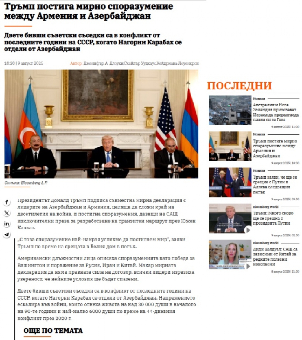 Bolqarıstanın aparıcı media qurumları ABŞ Prezidenti Donald Trampın vasitəçiliyi ilə Azərbaycan Prezidenti İlham Əliyev və Ermənistanın Baş naziri Nikol Paşinyan arasında Vaşinqtonda imzalanan tarixi sülh sazişini geniş işıqlandırıb.