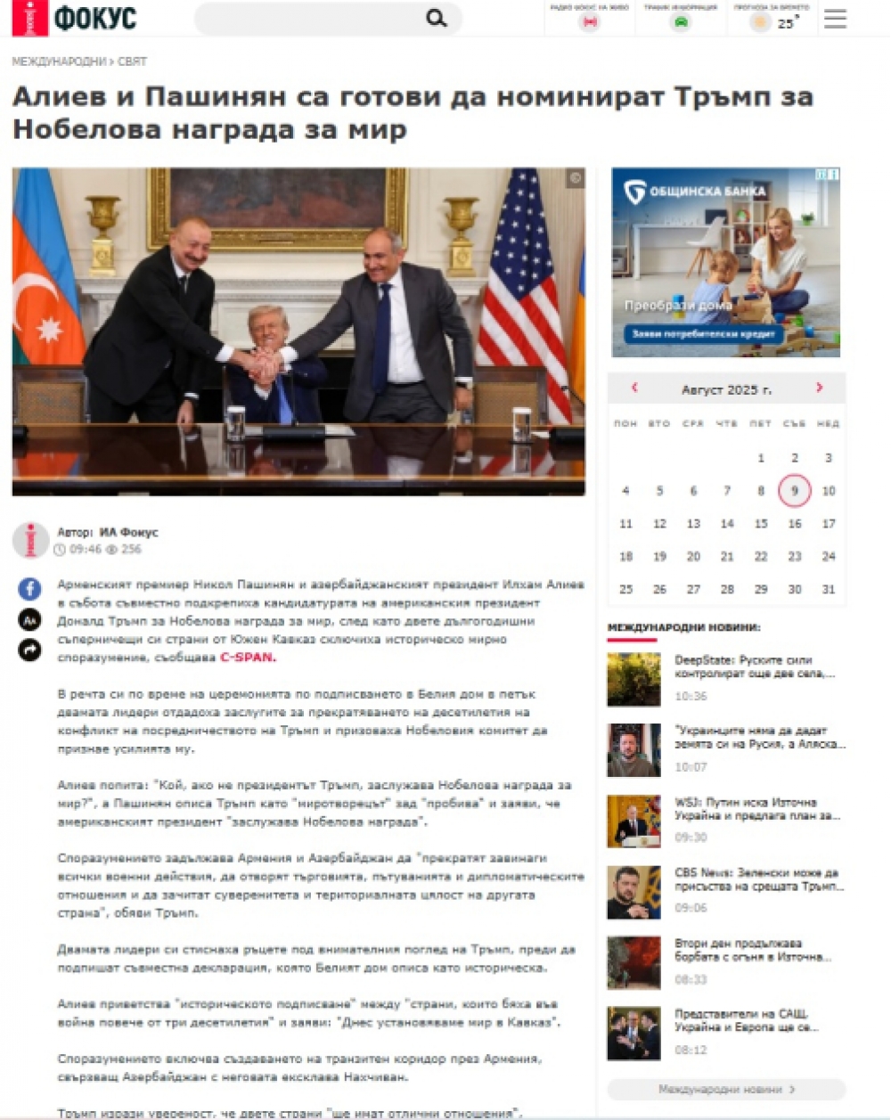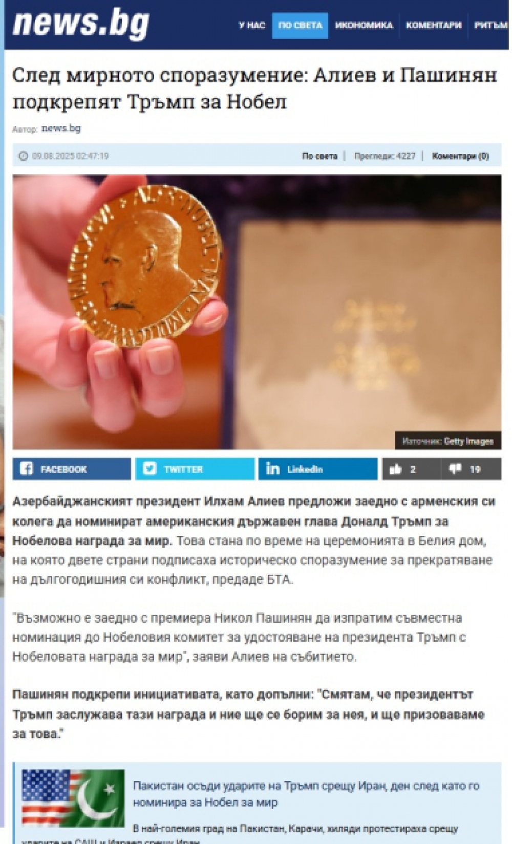 BTA – Bolqarıstan milli xəbər agentliyi isə yazır ki, Azərbaycan və Ermənistanın ABŞ Prezidentini Nobel Sülh Mükafatına namizəd göstərmək barədə birgə qərarı dünya diplomatiyasında nadir və simvolik addım kimi qiymətləndirilir.