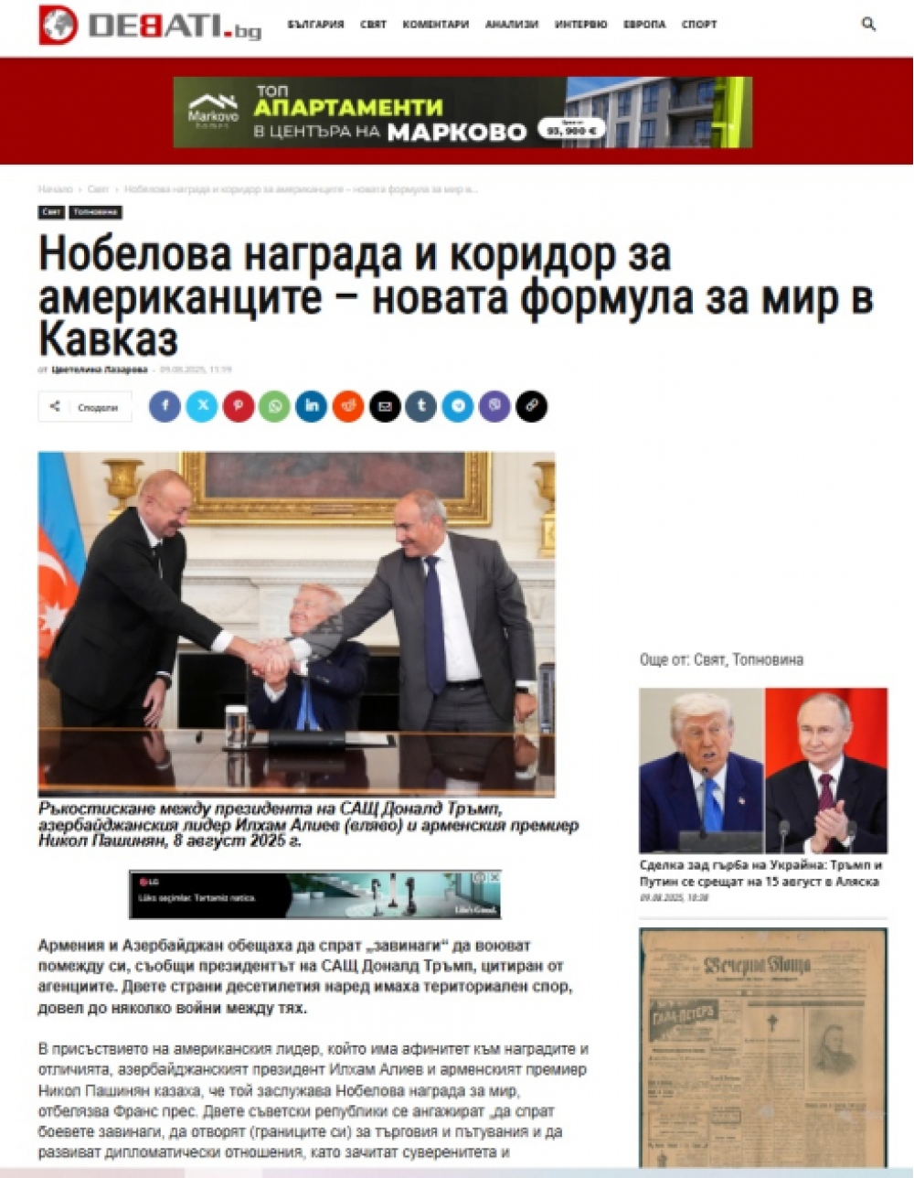 “İki sahil” xəbər verir ki, Bolqarıstan milli radiosu (BNR) Ağ Evdə keçirilən üçtərəfli görüşdə liderlərin uzunmüddətli sülhün bərqərar olması barədə razılığa gəldiklərini yazıb. Prezident İlham Əliyev və Baş nazir Nikol Paşinyanın Donald Trampın Nobel Sülh Mükafatına namizəd göstərilməsi təşəbbüsünü də elan etdikləri qeyd olunub. Xəbərdə vurğulanıb ki, saziş Naxçıvana birbaşa tranzit yolunun yaradılmasını da nəzərdə tutur.