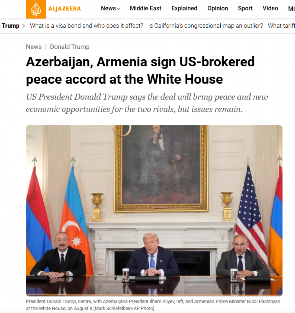 “Al Jazeera” vurğulayır ki, ABŞ Prezidenti Donald Trampın vasitəçiliyi ilə Azərbaycan və Ermənistan arasında sülh sazişinin paraflanması Cənubi Qafqaz üçün dönüş nöqtəsidir. "Saziş təkcə onillər ərazində davam edən münaqişəyə son qoymur, həm də regional ticarət və əməkdaşlıq üçün yeni imkanlar açır. ABŞ-nin vasitəçi kimi iştirakı Vaşinqtonun ənənəvi olaraq Rusiyanın maraq zonası hesab edilən regionda möhkəmlənmək istəyini vurğulayır”, - nəşr qeyd edib.