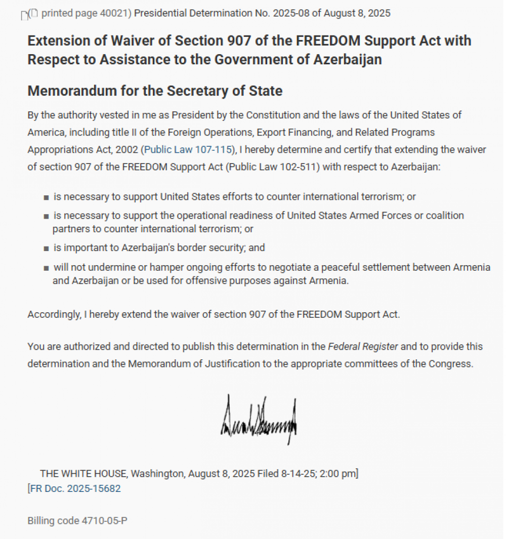ABŞ prezidenti Donald Tramp Azadlığa Dəstək Aktının 907-ci maddəsinin fəaliyyətinin dayandırılması haqqında memorandum imzalayıb.