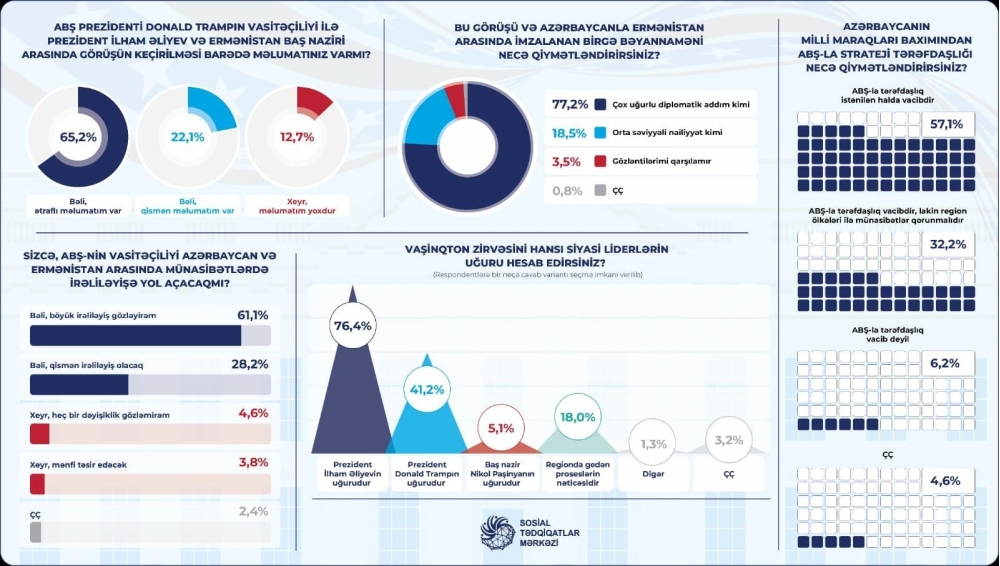 Belə ki, nəticələrə əsasən respondentlərin 87,3%-i ABŞ Prezidenti Donald Trampın vasitəçiliyi ilə Prezident İlham Əliyev və Ermənistan baş naziri arasında keçirilən görüş barədə məlumatlı olduğunu bildirib. Onların 65,2%-i bu barədə ətraflı məlumata sahib olduğunu bildirərkən, 22,1%-i qismən məlumatlı olduğunu qeyd edib. Məlumatsız olan respondentlər cəmi 12,7% təşkil edib.