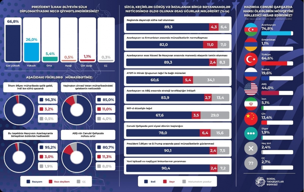 Sorğunun nəticələri Prezident İlham Əliyevin sülh diplomatiyasına ictimai dəstəyin yüksək olduğunu və bu siyasətin milli maraqlar baxımından uğurlu, məqsədyönlü kimi qəbul edildiyini göstərib. Belə ki, respondentlərin böyük əksəriyyəti Prezident İlham Əliyevin sülh diplomatiyasını ümumilikdə yüksək (92,8%) qiymətləndirib. Respondentlərin 66,8%-i bu siyasəti çox yüksək, 26,0%-i isə yüksək səviyyədə dəyərləndirib. Orta qiymətləndirənlər 5,4%, aşağı səviyyədə dəyərləndirənlər isə ümumilikdə 1,6% olub.
