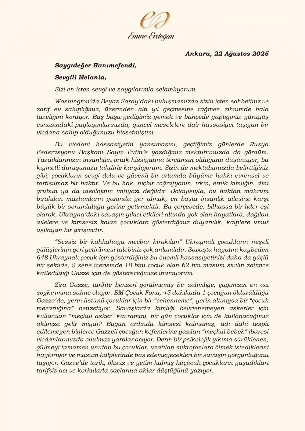 Türkiyənin birinci xanımı Əminə Ərdoğan ABŞ-nin birinci xanımı Melaniya Trampa məktub göndərib.
