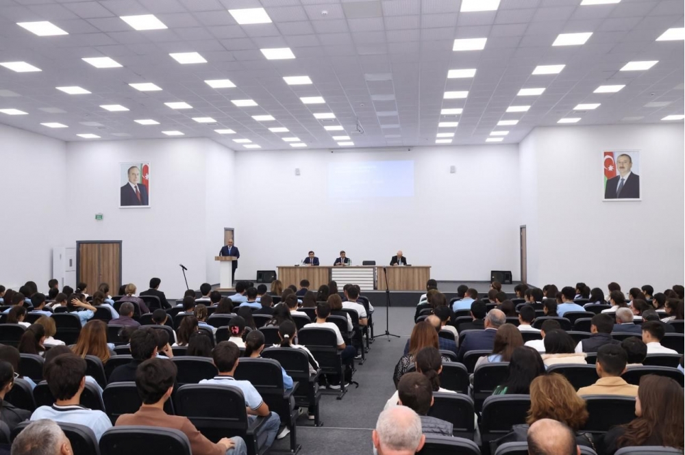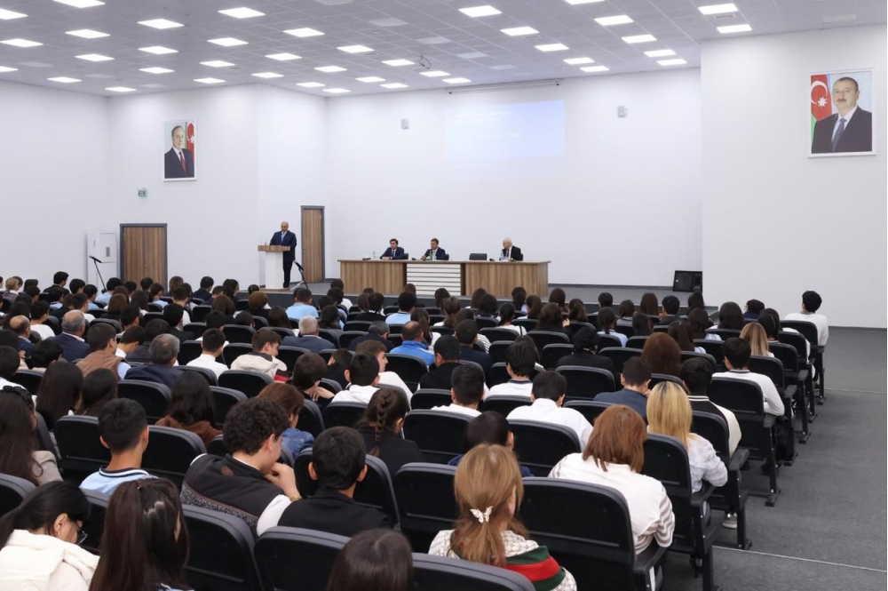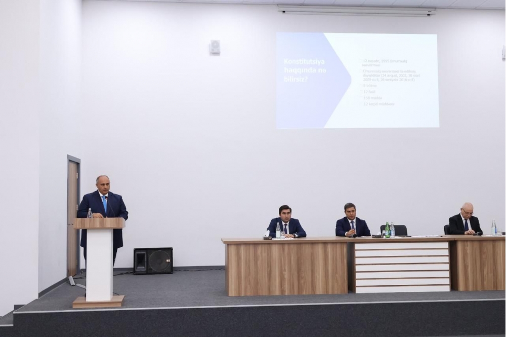 “İki sahil” xəbər verir ki, tədbirdə çıxış edən BSU-nun rektoru Anar Nağıyev tələbələr qarşısında dövlətin qanunvericilik bazasının əsasını təşkil edən Azərbaycan Respublikasının Konstitusiyasının formalaşması, onun əhəmiyyəti barədə bəhs edib. Konstitusiyamızın banisi Ulu Öndər Heydər Əliyevin Azərbaycana rəhbərlik etdiyi 1969-1982-ci illərdə Azərbaycan xalqı üçün gördüyü işlərin önəmini bir daha diqqətə çatdıran rektor çıxışı zamanı Ümummilli Lider Heydər Əliyevin səyi və təşəbbüsü ilə 1978-ci ildə Azərbaycan SSR Konstitusiyasında Azərbaycan dilinin dövlət dili kimi təsbit olunmasının əhəmiyyətini vurğulayıb. O, bildirib ki, bu gün Ulu Öndərin ideyalarının layiqli davamçısı Prezident İlham Əliyevin rəhbərliyi ilə həyata keçirilən tədbirlər, ölkə iqtisadiyyatının, qüdrətinin artması Azərbaycan regional güc mərkəzinə çevrilib. A.Nağıyev Ali Baş Komandanın rəhbərliyi ilə Müzəffər Azərbaycan ordusunun vətən torpaqlarının işğaldan azad edilməsi yolunda canlarını qurban verməsini, gənclərin milli vətənpərvərlik ruhunda yetişməsinin əhəmiyyətini qeyd edib. Müasir Azərbaycan gəncliyinin milli birliyə, milli ideologiyaya sadiqliyindən bəhs edən rektor gənclərin yeni dövr Azərbaycanı üçün əhəmiyyətini vurğulayıb.