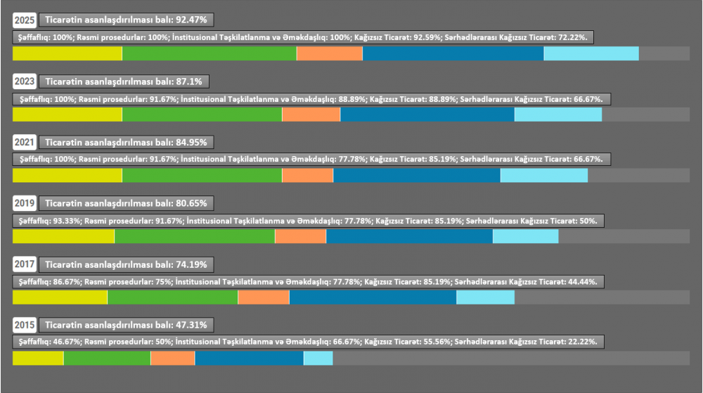 Bundan əlavə, Azərbaycanın Ümumi Ticarətin Asanlaşdırılması üzrə göstəricisi 2015-ci ildəki 47,31 faizdən 2025-ci ildə 92,47 faizə yüksəlib və UNECE regionunda ən yüksək artım tempinə malik ölkələrdən birinə çevrilib. Bu nailiyyətlər şəffaflıq, prosedurların sadələşdirilməsi və institusional əməkdaşlıq tədbirlərinin tam icrası, eləcə də kağızsız ticarətin inkişafı (92,59 faiz) sayəsində mümkün olub.