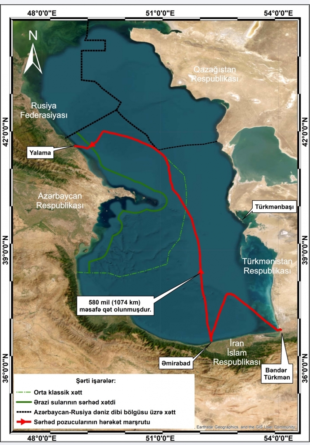 Sərhəd pozucularının üzərindən aşkar edilmiş “Garmin” markalı GPS qurğusunun yaddaşına baxış keçirilərkən onların İran İslam Respublikası ərazisindən 1074 km məsafə qət edib Türkmənistan Respublikasının ərazi sularından keçməklə Azərbaycan Respublikasının ərazisinə daxil olması müəyyən edilmişdir.