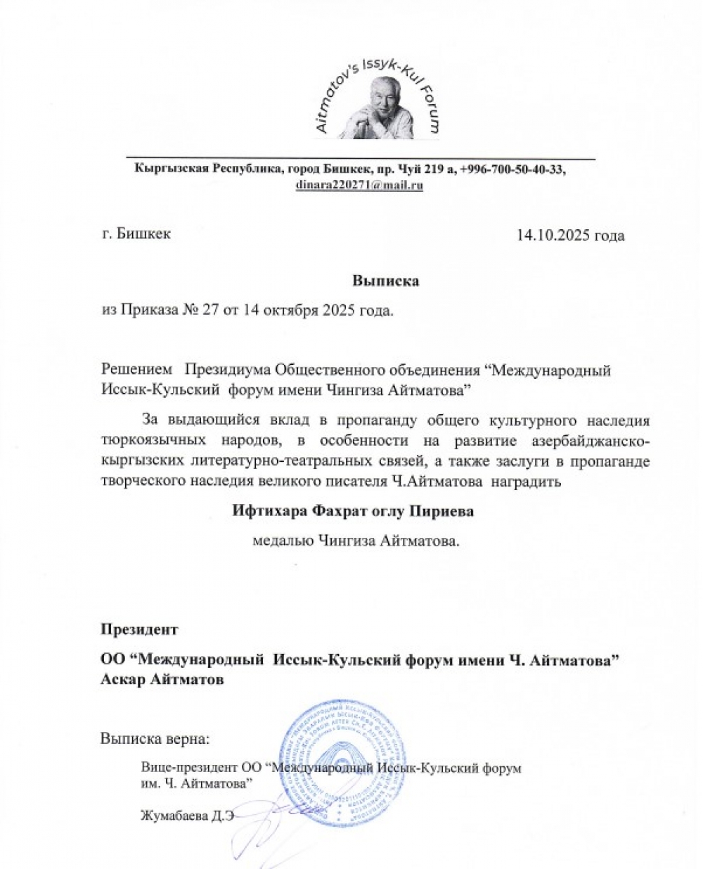 “İki sahil” xəbər verir ki, “Beynəlxalq İssık-Kul Forumu”nun vitse-prezidenti Dinara Cumabayevanın verdiyi məlumata görə, “Çingiz Aytmatov adına Beynəlxalq İssık-Kul Forumu” Rəyasət Heyətinin qərarı ilə incəsənət vasitəsilə xalqlar arasında sülhün və dostluğun möhkəmləndirilməsində müstəsna xidmətlərinə, türkdilli xalqların ortaq mədəni irsinin təbliğinə, xüsusilə Azərbaycan-Qırğızıstan ədəbi və teatr əlaqələrinin inkişafına verdiyi mühüm töhfəyə görə İftixar Piriyev “Çingiz Aytmatov” medalı ilə təltif edilib.