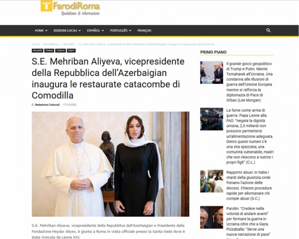 Məqalələrdə, eyni zamanda, Azərbaycanın Birinci vitse-prezidenti Mehriban Əliyevanın iştirakı ilə oktyabrın 16-da Müqəddəs Kommodilla katakombalarının bərpası layihəsinin açılışının olduğu xatırladılır. Diqqətə çatdırılır ki, erkən xristianlıq dövrünə aid ilk artefaktların mövcud olduğu katakomba Felisio və Adauktus adlı xristian əzabkeşlərinin dəfn olunduğu məkan kimi də tanınır və orta əsrlərdə möminlərin ziyarətgahı olub. 2021-ci il martın 4-də Heydər Əliyev Fondu və Müqəddəs Arxeologiya üzrə Pontifik Komissiyası arasında Kommodilla katakombalarının bərpası ilə bağlı müqavilə imzalandığı bildirilir. Daha əvvəllər isə Heydər Əliyev Fondunun səyləri nəticəsində Müqəddəs Marçelino və Pietro, həmçinin Müqəddəs Sebastian katakombalarının bərpası layihələri həyata keçirildiyi xatırladılıb.
