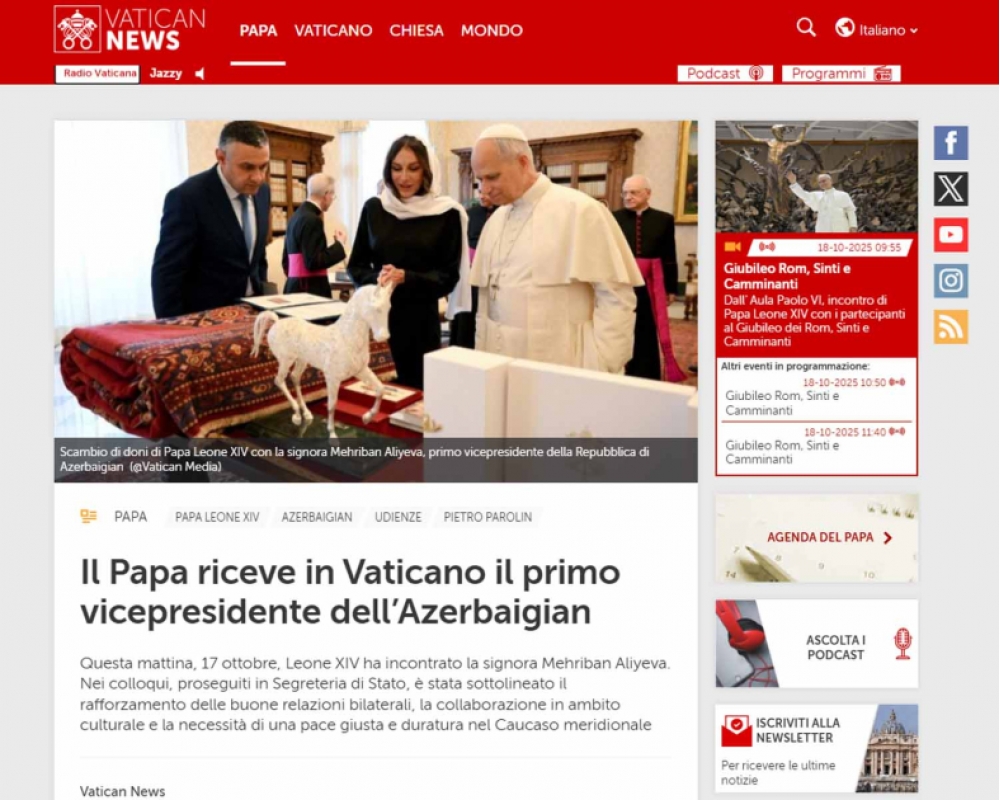 Müqəddəs Taxt-Tacın və İtaliyanın aparıcı mətbu orqanları Azərbaycanın Birinci vitse-prezidenti Mehriban Əliyevanın Vatikana rəsmi səfəri çərçivəsində oktyabrın 17-də Roma Papası XIV Leo ilə görüşünə geniş yer ayırıb.