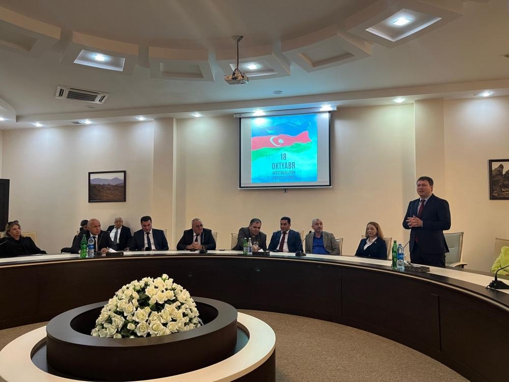 Tədbirdə çıxış edən YAP Qaradağ Rayon təşkilatının sədri Qafar Əliyev qədim və zəngin tarixə malik olan Azərbaycan xalqının müstəqillik uğrunda uzun illər davam edən mübarizəsi haqqında ətraflı məlumat verib. O bildirib ki, tarix boyu öz ərazilərində bir çox dövlətlər quran Azərbaycan xalqı tarixə bir neçə imperiyanın yaradıcısı kimi də daxil olub. Həmin imperiyalar böyük əraziləri əhatə etsələr də XVIII əsrin ortalarında parçalanmaya məruz qalıb və bu ərazilərdə xanlıqlar yaranıb. Bu səbəbdən də qonşu dövlətlər tərəfindən zəbt edilərək dövlətçiliyini itirib, onun bir hissəsi Car Rusiyasının, digər hissəsi isə İranın tərkibinə daxil edilib. 1917-ci ilin Fevral inqilabından sonra yenidən müstəqillik qazanan xalqımız Şərqin ilk demokratik respublikası olan Azərbaycan Xalq Cümhuriyyətini yaratsa da, bu dövlət cəmi 23 ay yaşayıb. Bolşeviklər tərəfindən işğal edilən ölkəmizdə Azərbaycan Sovet Respublikası elan edilib və o, 1922-ci ilin dekabrında SSRİ-nin tərkibinə daxil olub. XX əsrin 80-ci illərinin sonlarında yaranmış tarixi şərait nəticəsində xalqımız yenidən öz dövlət müstəqilliyini bərpa etmək şansı qazanaraq onu 1991-ci il oktaybrın 18-də elan edib.